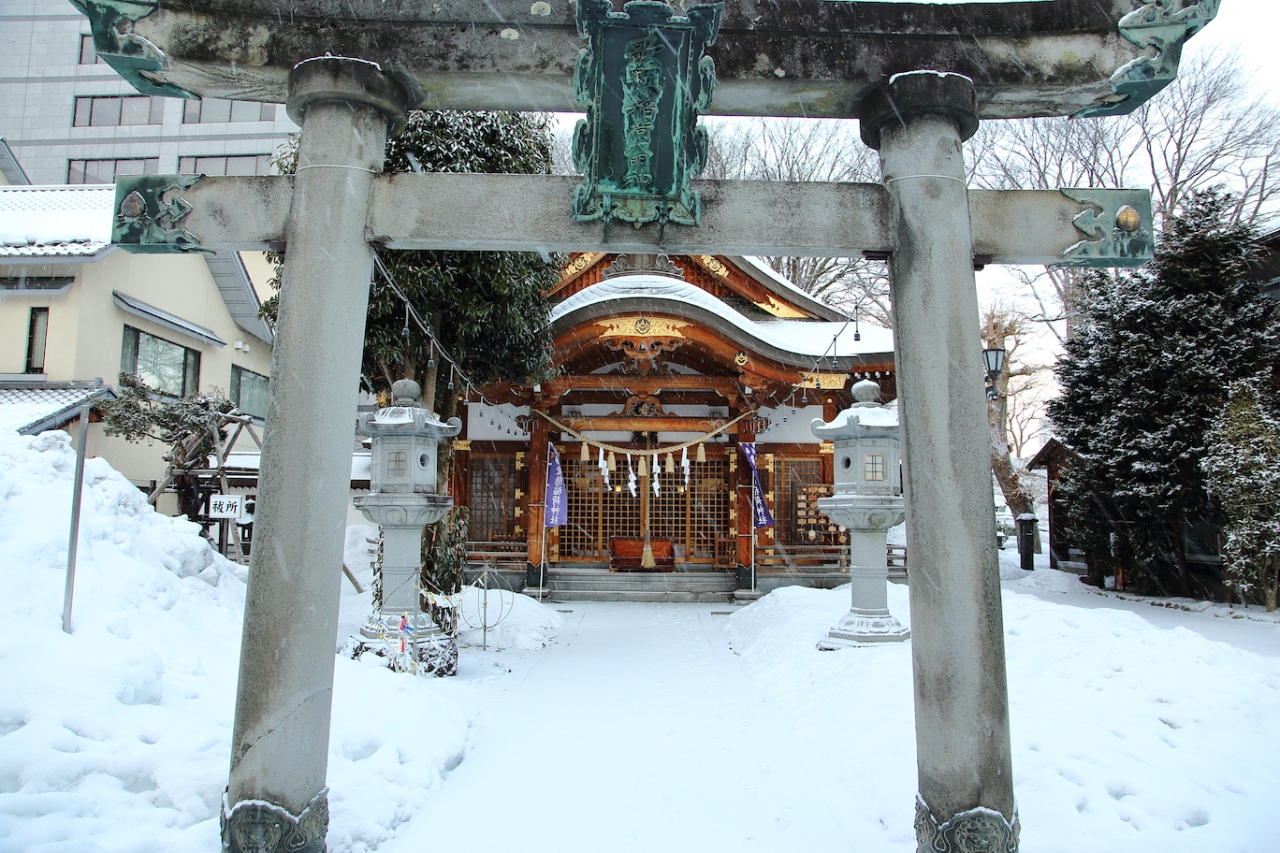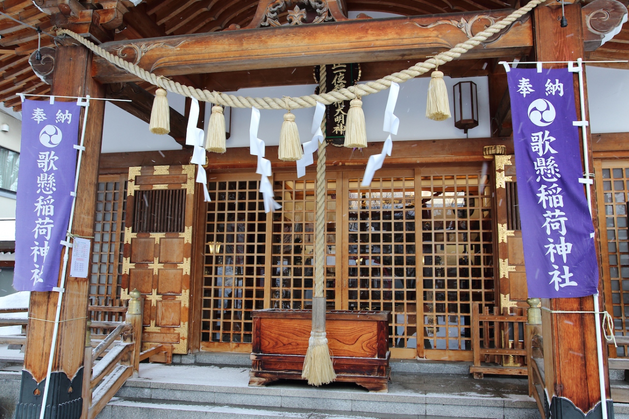山形市の中心街にあるお稲荷さんです。山形駅からも近く、東口から出て大通りをまっすぐ進むと左手側にあります。距離は5、600m程度ですので、のんびり散歩がてら歩いて行けます。有名な蕎麦屋さんである三津屋さんの並びなので、三津屋さんの看板を目印にすると分かり易いでしょう。