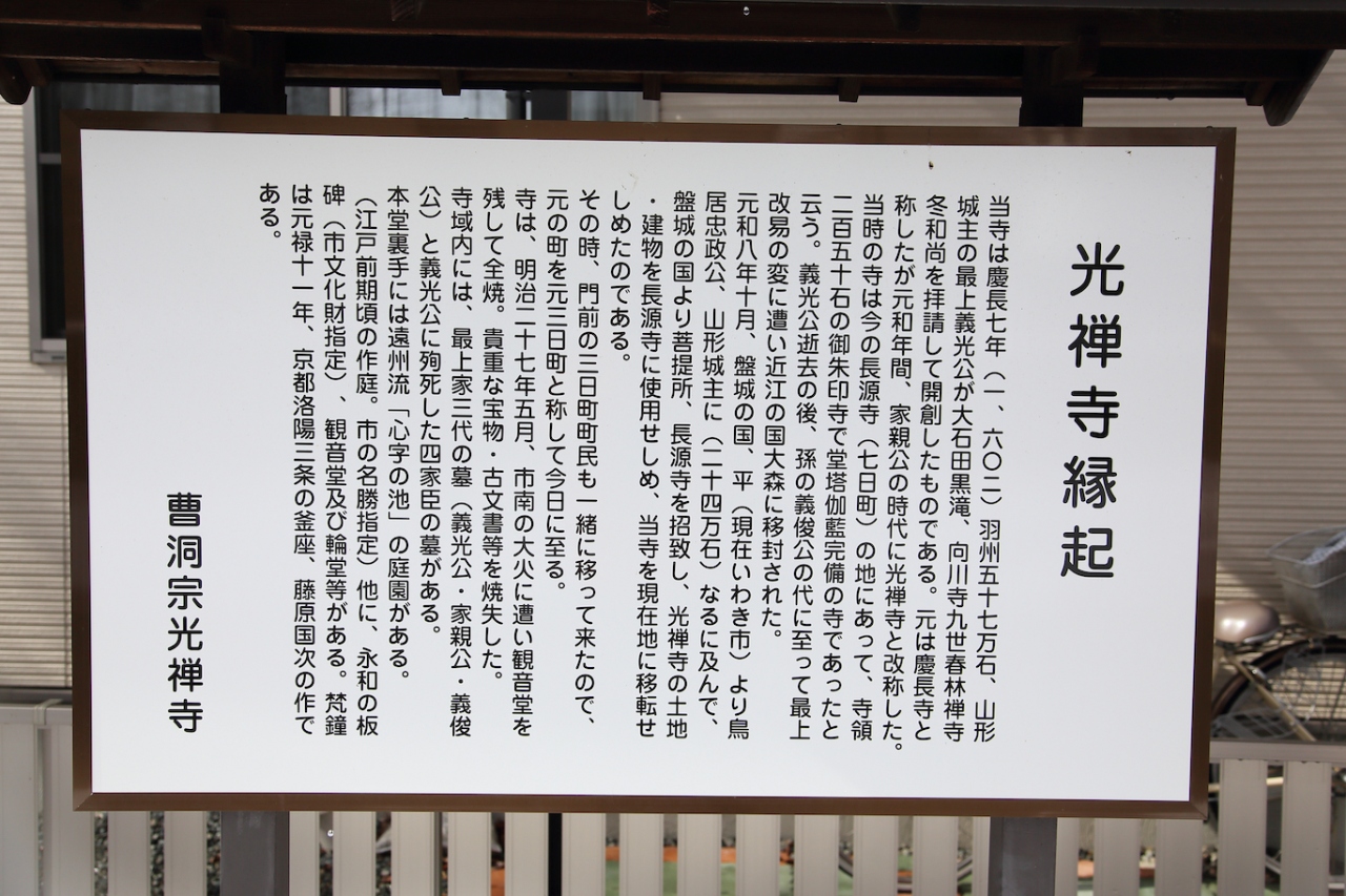 山形の英雄、最上義光公が自身の菩提寺とすべく建てた寺で、当時は慶長寺と名前だったそうです。往時は広大な寺領を有し、義光公の御霊屋や貴重な文物が残されていたそうですが、明治の大火で全て焼失してしまったそうです。ただ、今でも義光公の墓や殉死した家臣の墓も残されており、最上家の残り香を感じることが出来ます。歴史好きな方なら訪れて損は無いでしょう。- 旅行時期