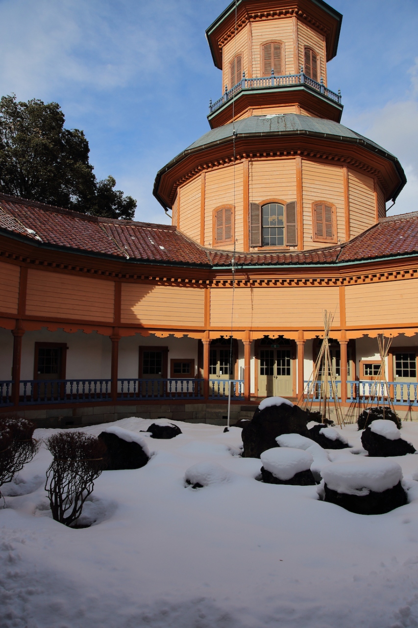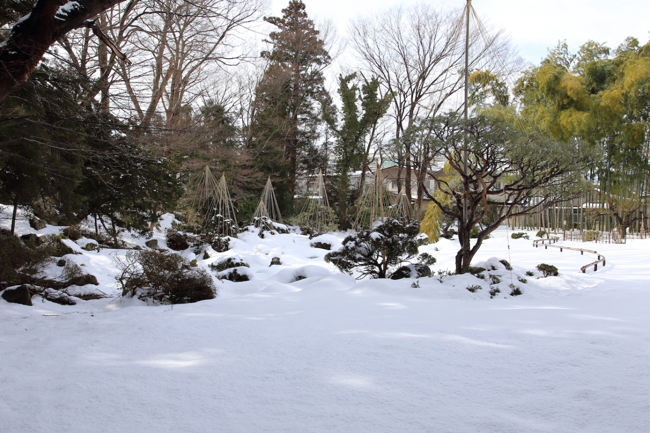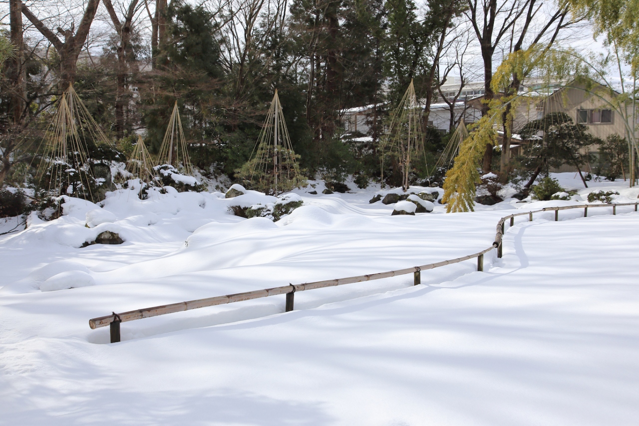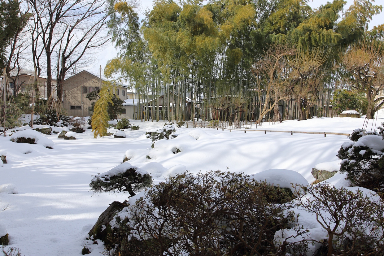 庭園は東西に長く、竹林や池を配置し、竹垣によって空間を分割した趣のあるものです。ただ、訪問したのが真冬だったため、池は全く見えず、竹垣も中途半端に頭を出している状態で、あまり趣は感じられませんでした。こちらに訪問するなら雪の無い季節のほうが良さそうです。- 旅行時期