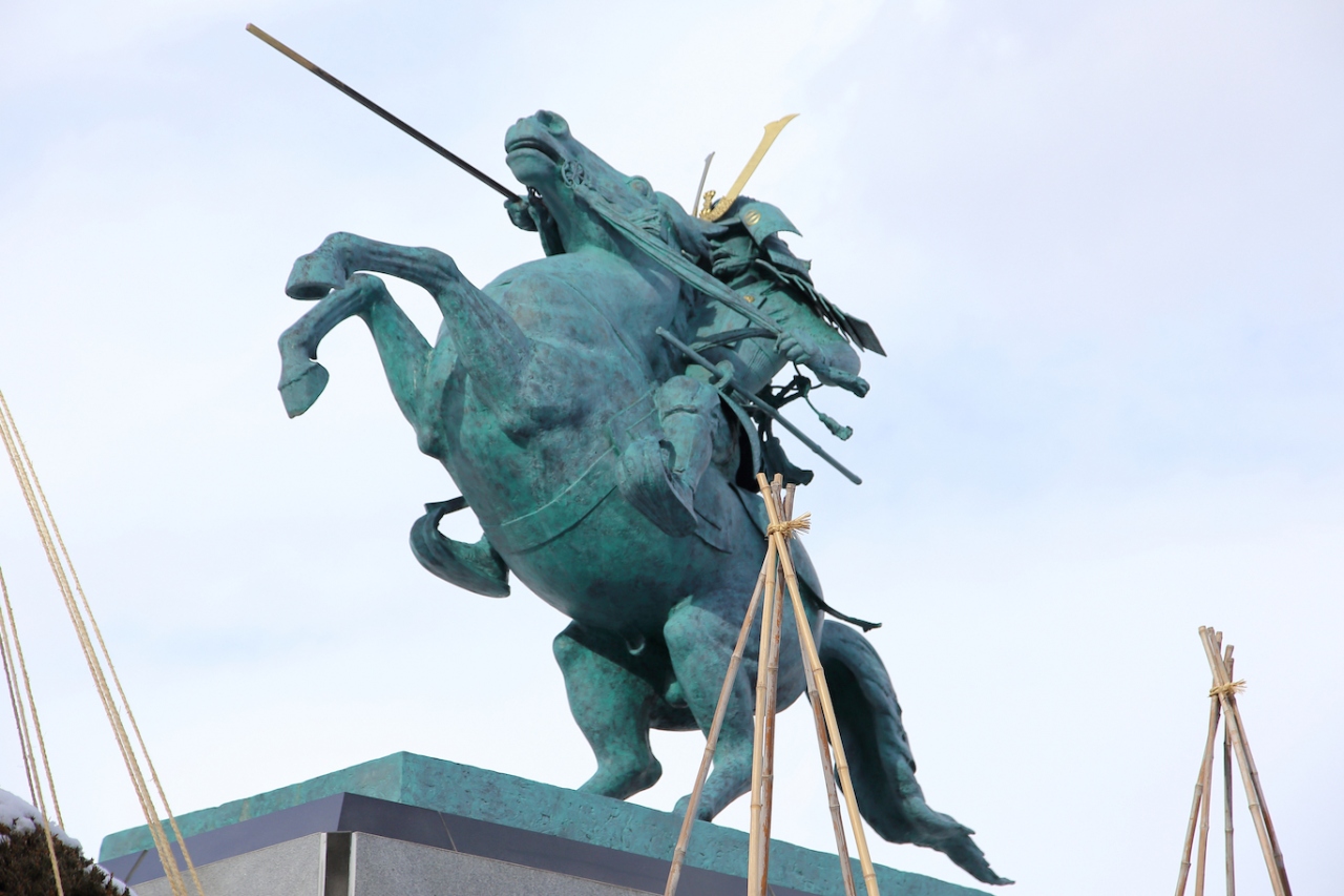 霞城公園に設置されている最上義光公の銅像です。普通、銅像という立像か坐像、珍しいところでは馬に跨ったものもありますが、大抵は静かな雰囲気を醸し出していますが、この銅像は全く違います。馬に跨った像ではありますが、馬は後ろ足で立ち、跨っている義光公も愛用の鉄の指揮棒を振りかざし、全軍に号令をかけている、という物凄く躍動感に溢れたものです。最初に見たときはびっくりしましたが、英雄義光公には却って相応しいように思えます。このような銅像は中々無いと思うので、是非見てみてください。なお、正面から見ると少々間が抜けています。