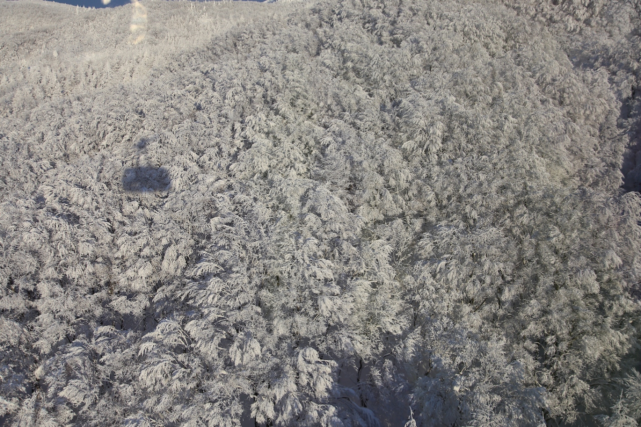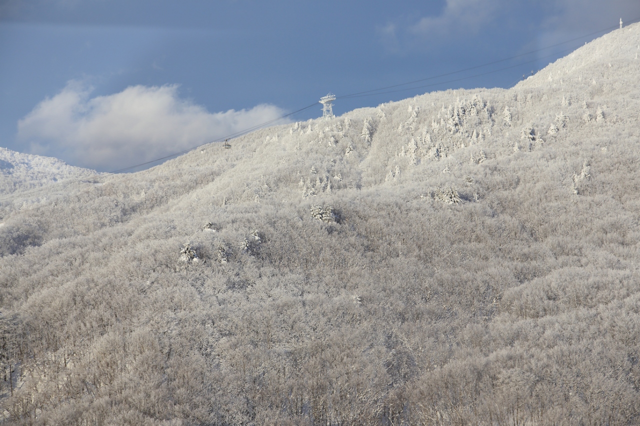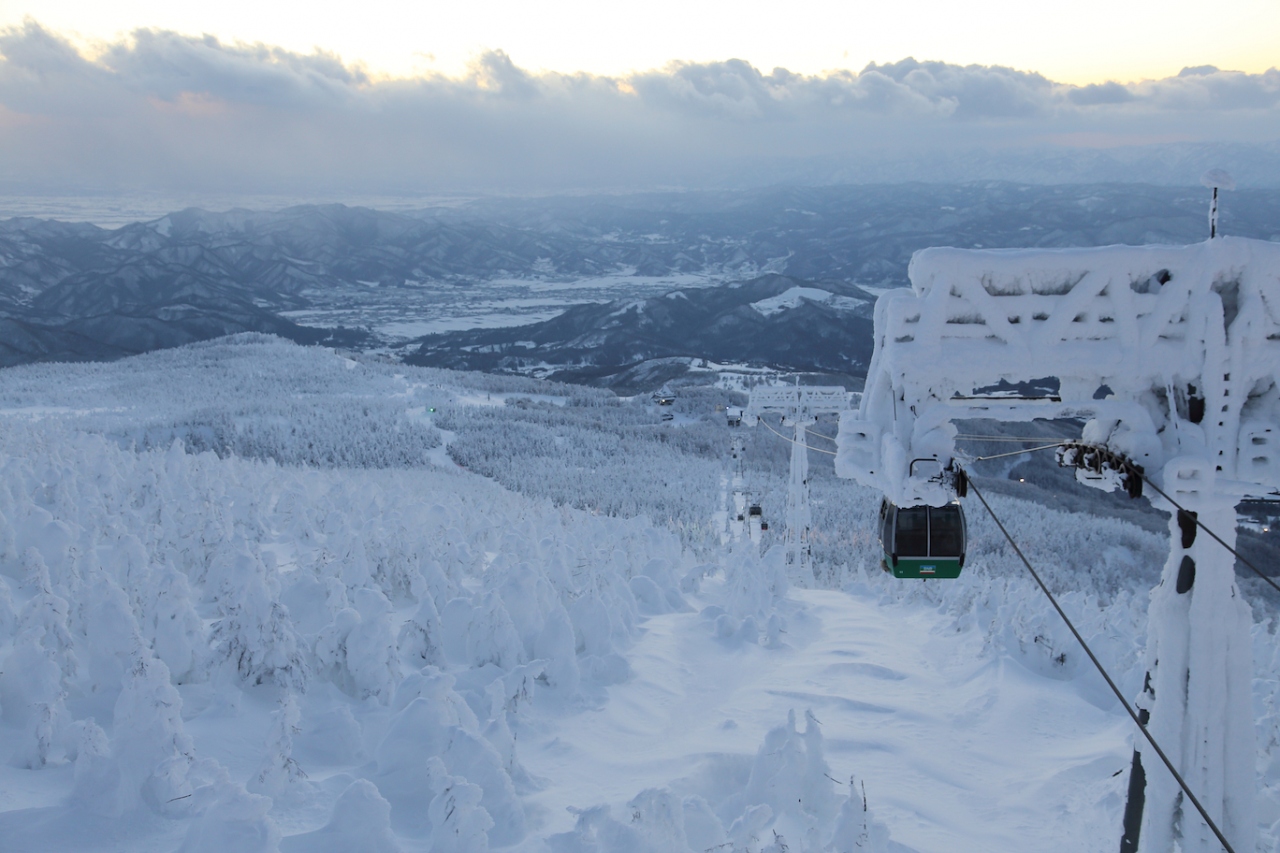 こちらのロープウェイはスキーヤーやスノーボーダーの他、樹氷の見物客も乗るので物凄く混雑します。樹氷見物客を優先してはくれますが、それでもかなり混雑します。ただ、天気さえ良ければゴンドラから絶景が楽しめます。山麓駅から樹氷高原駅までの間は霧氷を、樹氷高原駅から地蔵山頂駅までの間は樹氷を楽しめます。特に、樹氷高原から先はゴンドラの窓を開けられるので、クリアな写真を撮ることができます。但し、冬場に窓を開ける、というのはどう考えても迷惑行為です。ですので、自分一人とか、自分たちのグループしか乗っていないときにやってください。私は夕焼けとライトアップを見るために夕方に乗ったので、私一人しかおらず、心行くまで写真を撮ることができました。