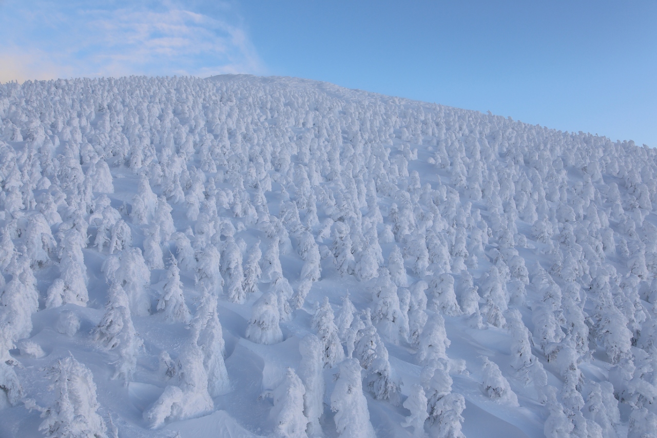 地蔵山頂付近に広がる樹氷林です。樹氷自体は他の地域でも見られますが、一番有名なのがこの蔵王の樹氷だと思います。昔は特定の人しか見られない光景でしたが、今では蔵王ロープウェイが地蔵山頂まで連れて行ってくれますので、天候さえ良ければ誰でも楽しむことができます。1つ1つの樹氷の格好が面白く、近づいて記念撮影をしている方も多いですが、斜面に並ぶ樹氷の光景も素晴らしいです。地蔵山頂駅の屋上が展望台になっていますから、是非そちらからの光景をご覧になってください。