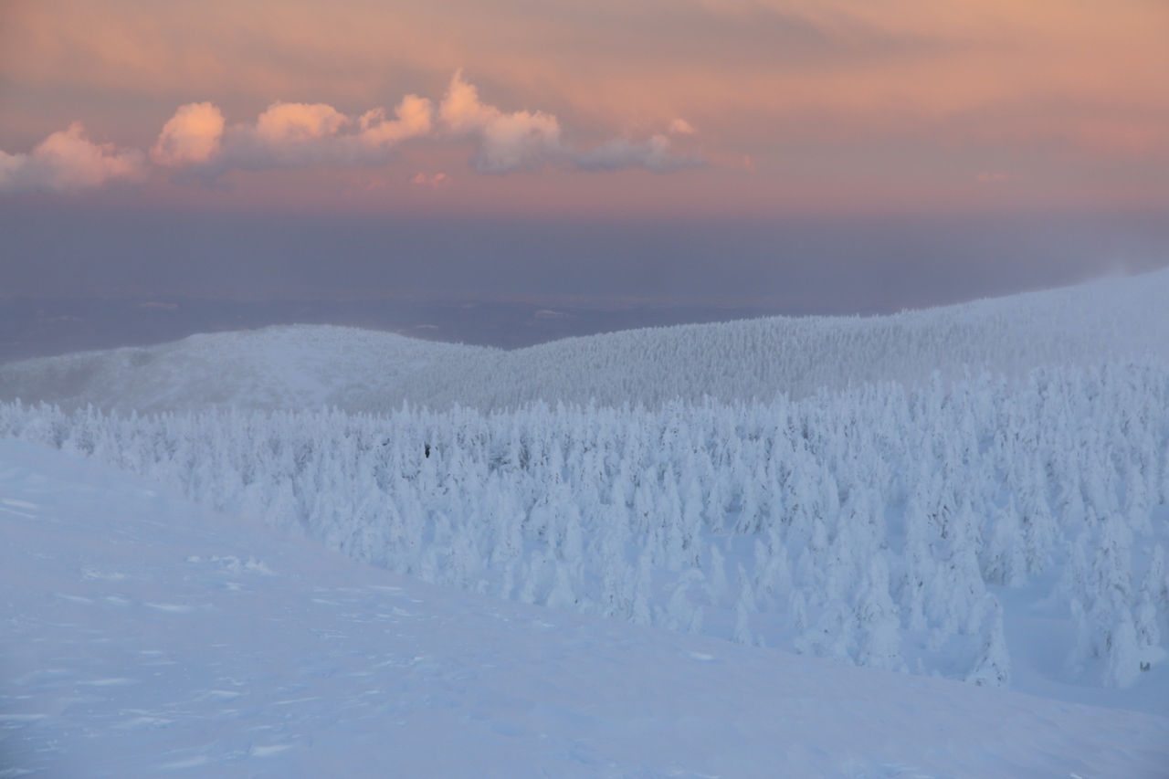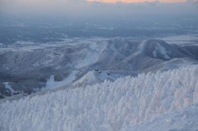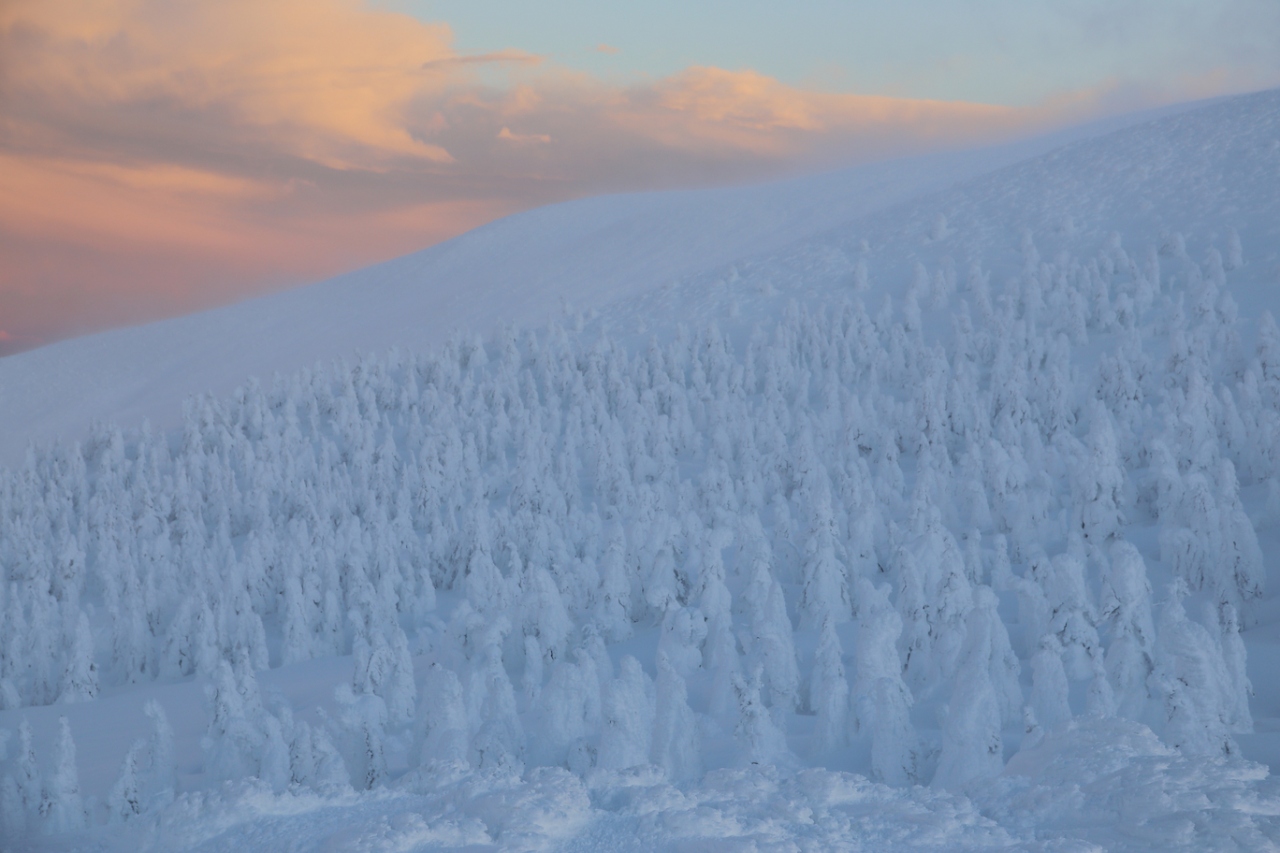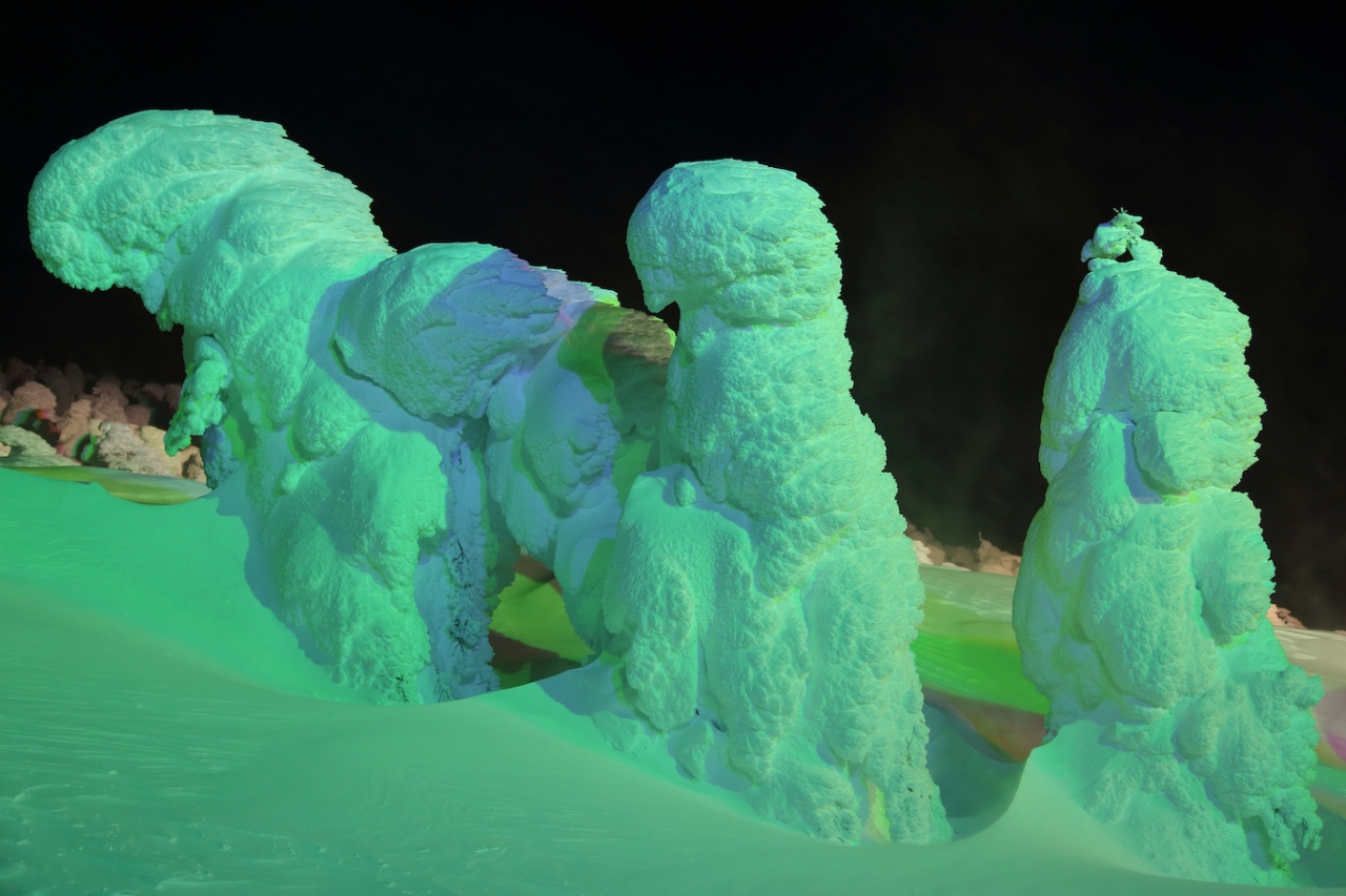 今回は夕焼けとライトアップを見る為に行きましたが、運良くくっきりとした樹氷群を見ることが出来ました。夕日に赤く照らされた樹氷群は美しく、また、ライトアップもモンスターぶりを際立たせていて、幻想的でした。是非一度は見て欲しい光景です。