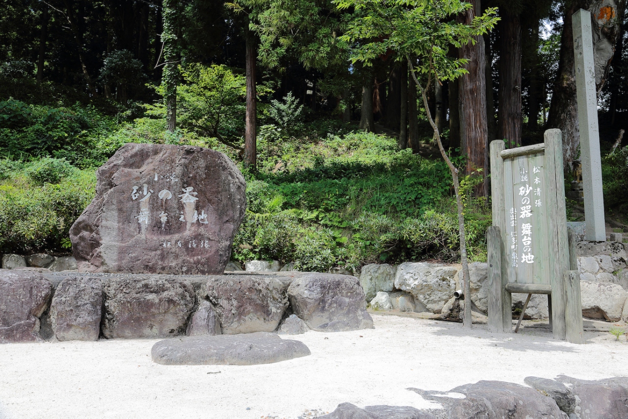 この記念碑は故松本清張氏自らが揮毫したもので、湯野神社の参道脇に置かれています。湯野神社自体も出雲国風土記に記録されているほどの古い神社ですが、作品の中では犯人のルーツとして非常に重要な役割を担っています。ですから、この場所に設置されているのは当然、という感じですね。今でも山深い場所ですので、作品の雰囲気を直接肌で味わうことが出来ます。松本清張ファンなら是非訪れてみてください。なお、湯野神社自体も大社造の立派なものなので、一緒に参拝されることをお勧めします。- 旅行時期