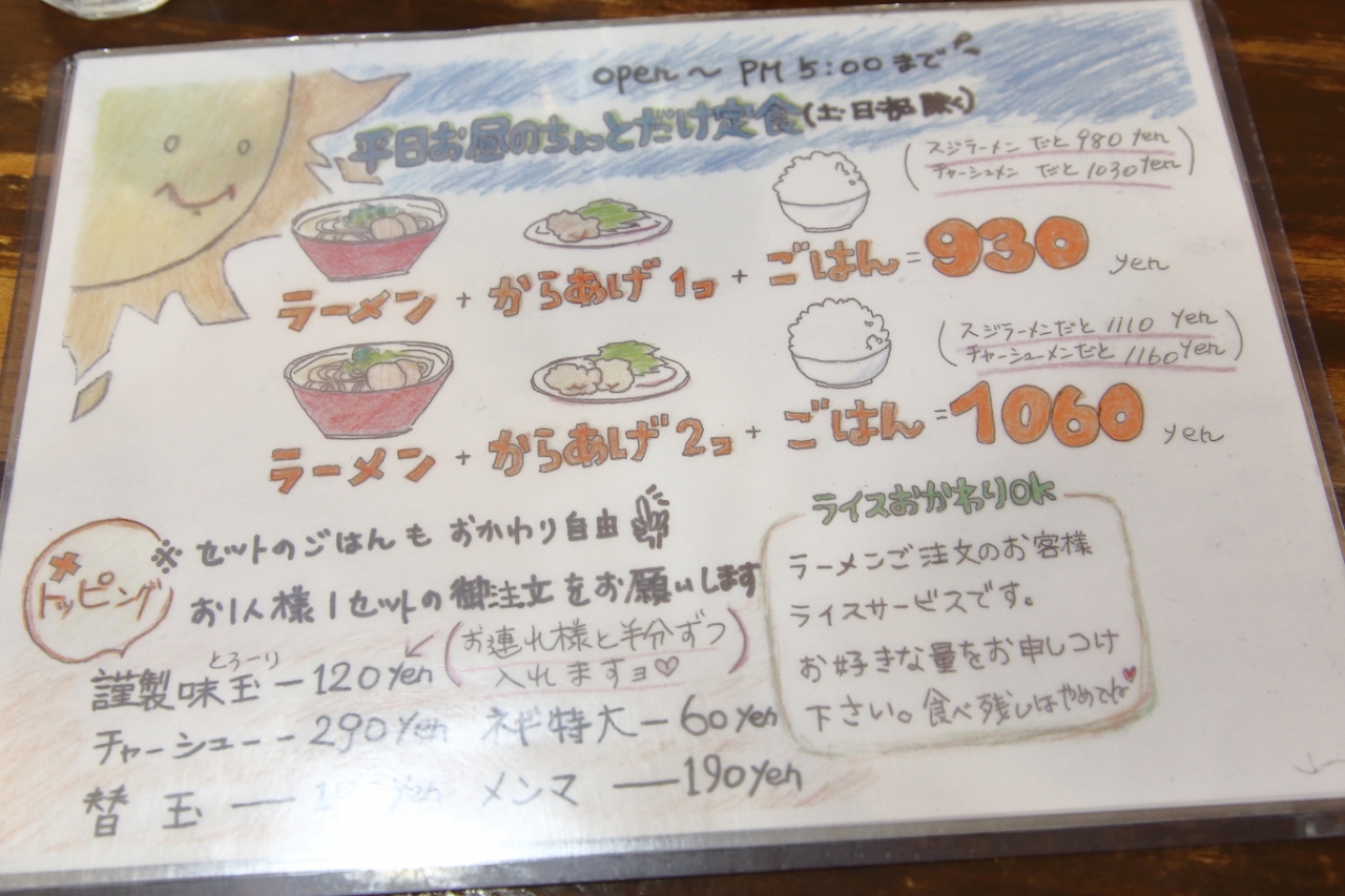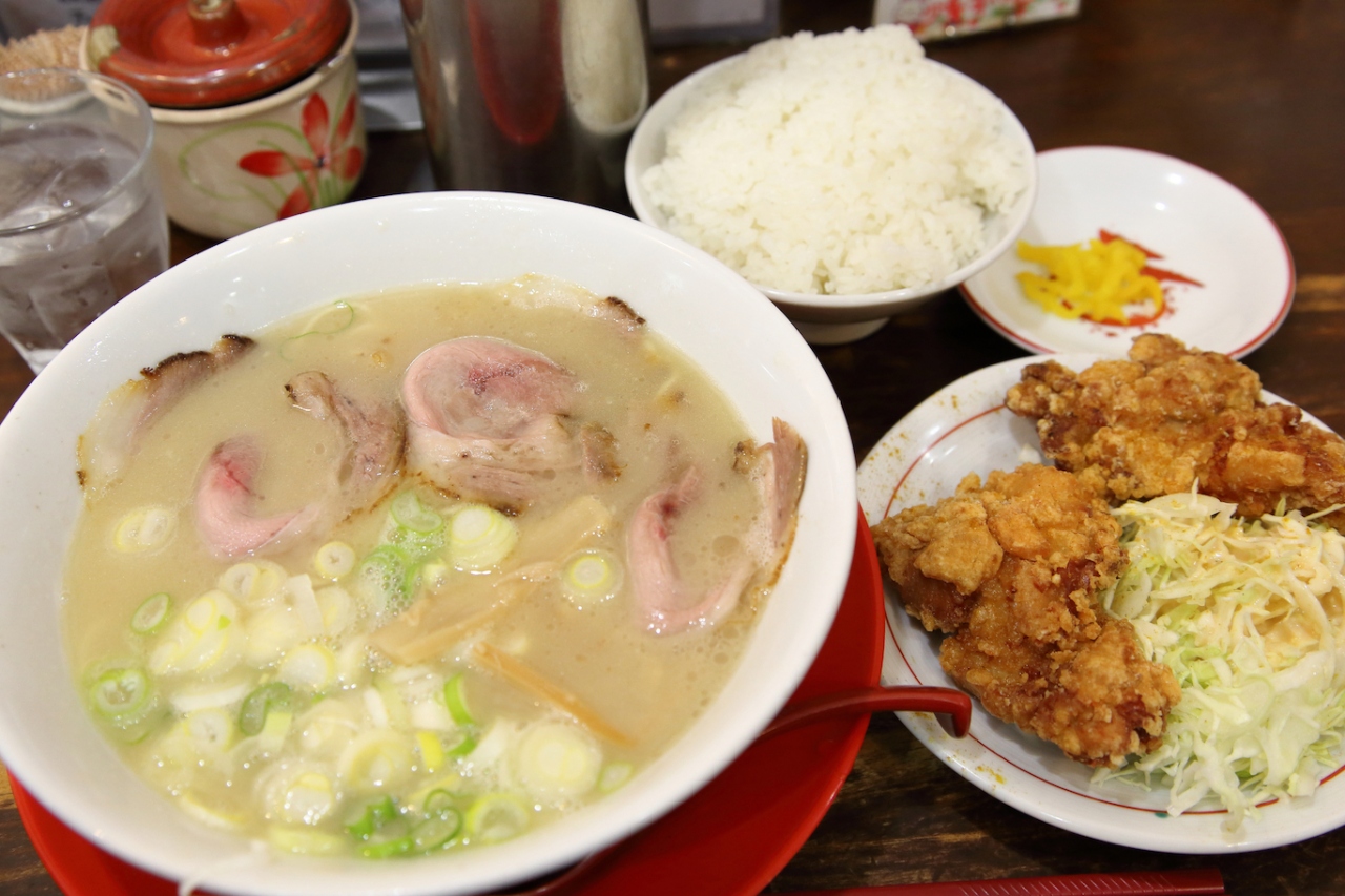 セットはとんこつラーメンと大きな唐揚げが2つ、大き目の茶碗に盛られたご飯と、大食漢の方でも十分満足できる量が出てきました。ラーメンはとんこつですがさっぱりしており、匂いもきつくないのであっさりと食べられました。唐揚げもカリッと揚げられていて、大変美味しかったです。また、唐揚げにはアクセントとしてカレー粉が掛けられていました。美味しい唐揚げが食べたい方や、大食漢の方にはお勧めのお店です。- 旅行時期