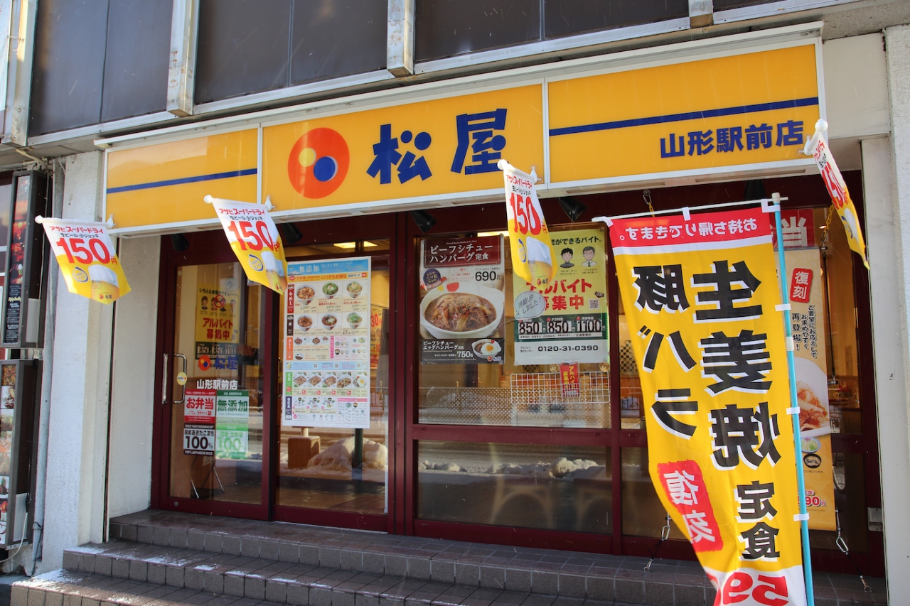 山形駅至近にある松屋です。山形駅の東口を出て、真正面の大通りをちょっと行った所にあります。距離は200mくらいなので、歩いても2、3分で着きます。山形駅に早朝に到着したので、朝食を食べる為に寄りました。