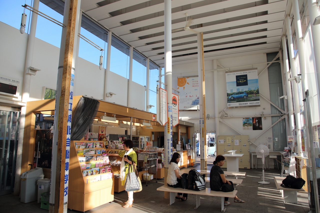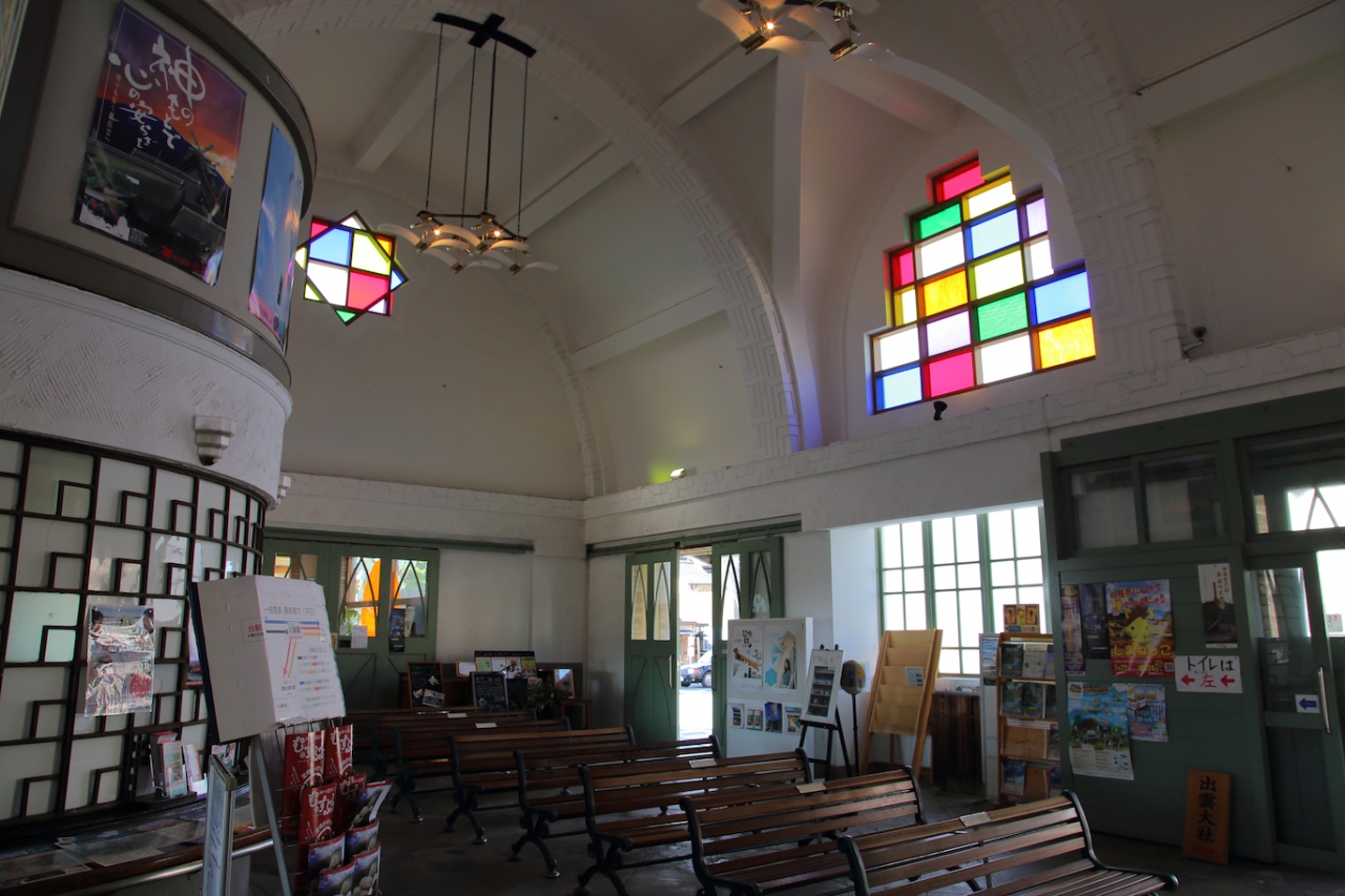 駅舎自体は小ぢんまりとしていますが、昭和初期の洋風建築で、ステンドグラスが嵌め込まれています。建設当時はモダンな建物だったようです。国の指定建造物にも指定されています。窓口と券売機のほか、観光パンフレットの置いてあるカウンターがあり、観光情報を入手できます。また、イタリアンカフェが併設されているので、食事を取ることも可能です。駅前のバス停から稲佐の浜、日御碕神社まで行けますから、観光の拠点としても非常に便利です。