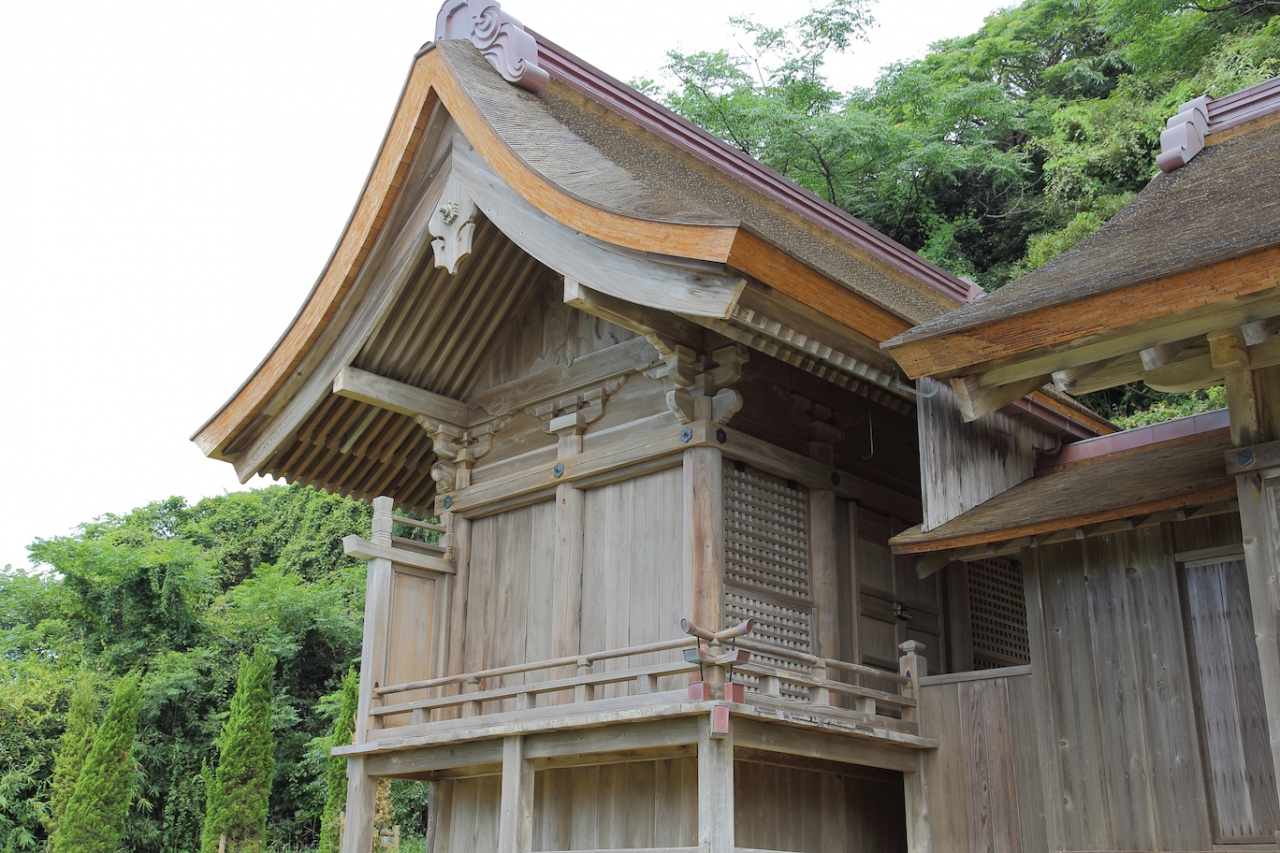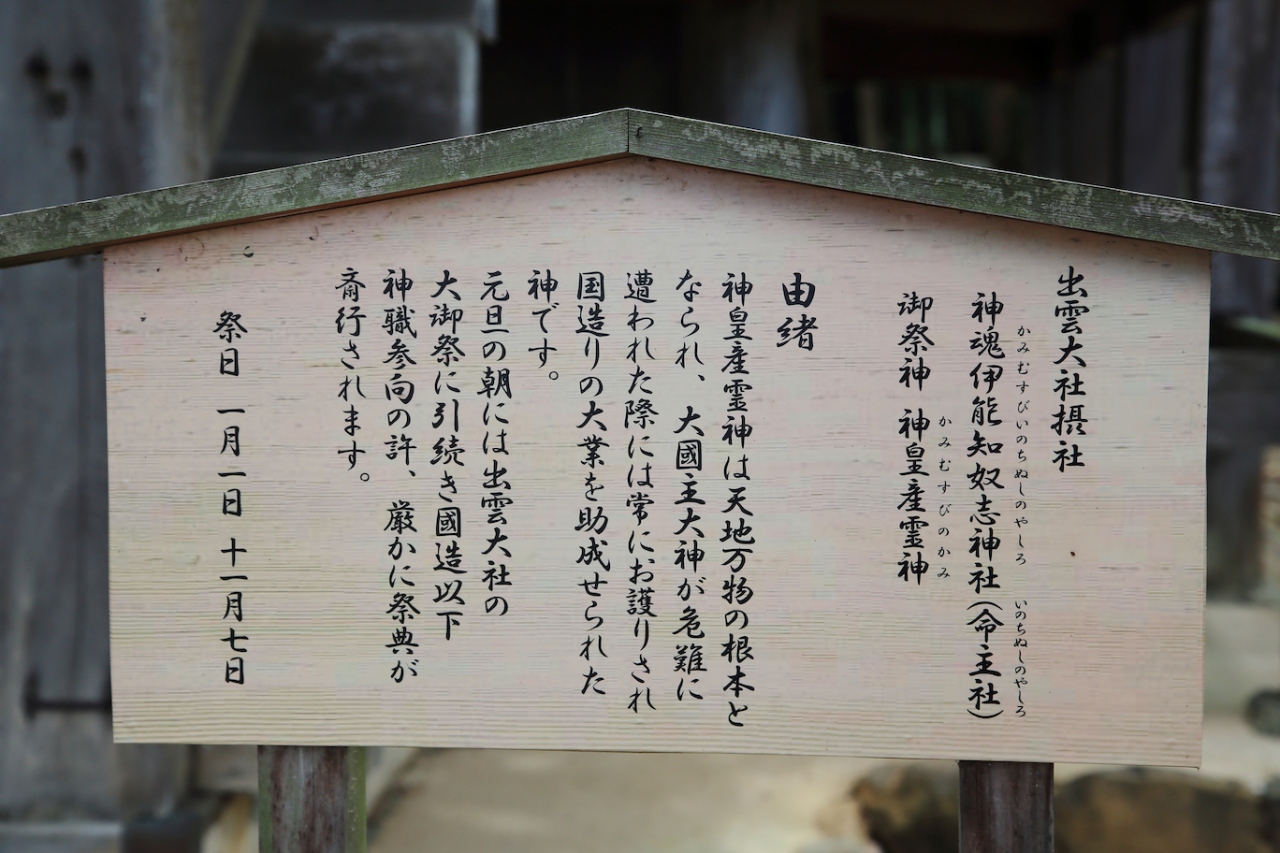 こちらの神社は神皇産霊神を祀っています。日本神話において、イザナミ、イザナギが産まれる前に現れた古い神様で、大国主命と関わりのある神様です。摂社だから当然ですが。神話では大国主命は何度か死にかけたり死んだりしていますが、神皇産霊神はその度に助けてくれたり生き返らせてくれている神様です。