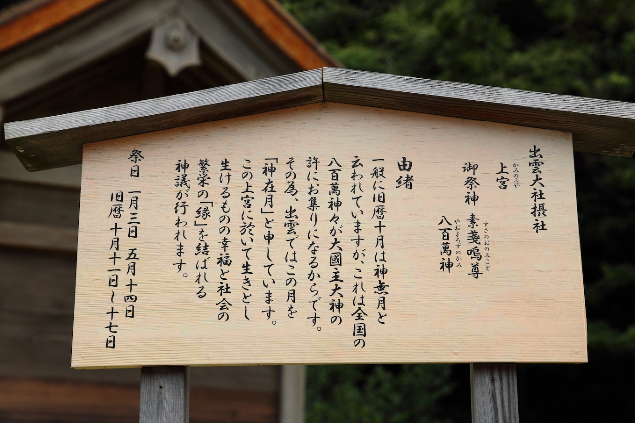 こちらの神社は大国主命の義理の父親である素戔嗚尊を祀っています。また、10月には全国から八百萬の神々が集まり、縁結びの会議を行う場所でもあります。その為、拝殿は10月のみ開放され、全国から縁結びを願う方が参拝の為に集まってくるようです。