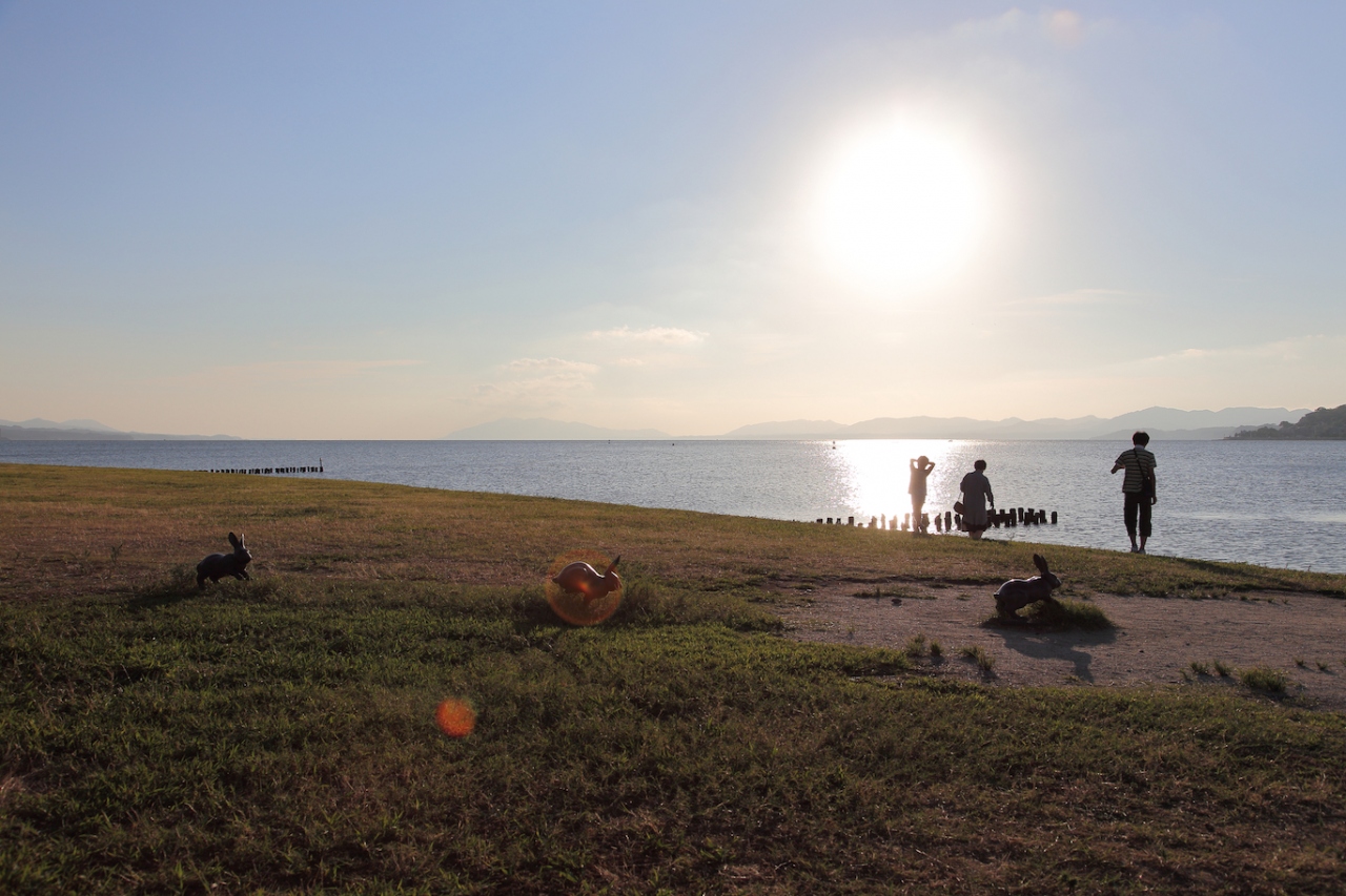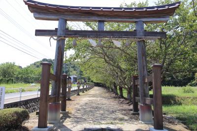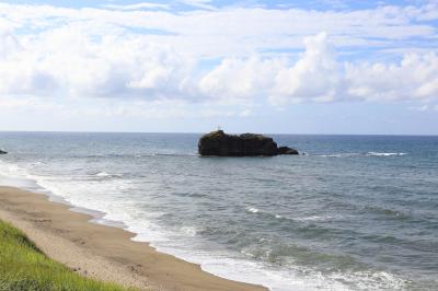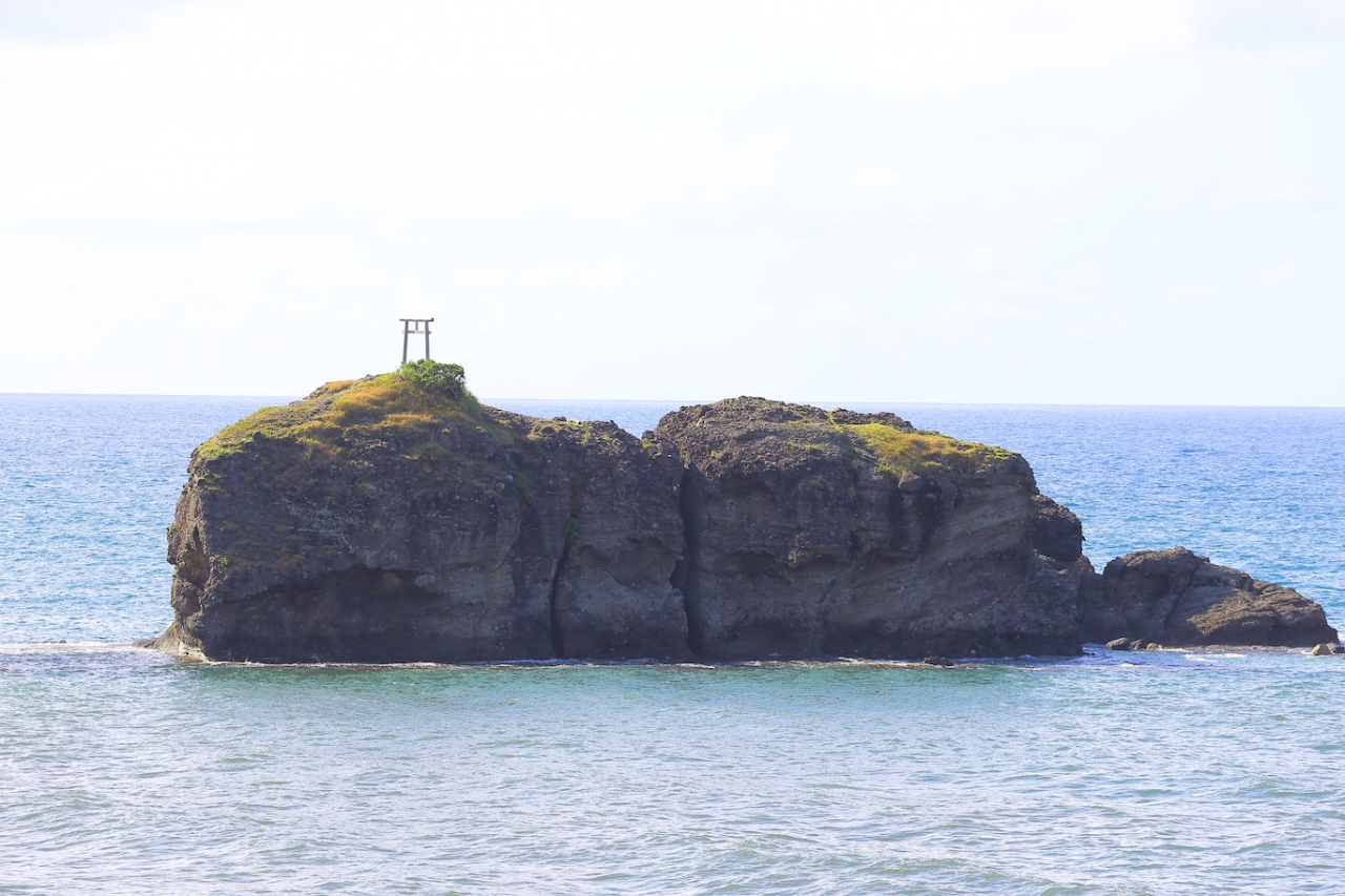 こちらは神話の舞台として有名ですが、海水浴場としても有名なようで、夏場は海水浴客で賑わうようです。ちょうど私が行ったのがお盆過ぎだったので、人影はまばらで、青い空と相まって美しい海岸線を楽しめました。沖には白兎が住んでいたと言われる沖の島があります。鳥居が立っているのがそれです。古事記には『淤岐島』とありますので、隠岐の島、という説もあるようですね。