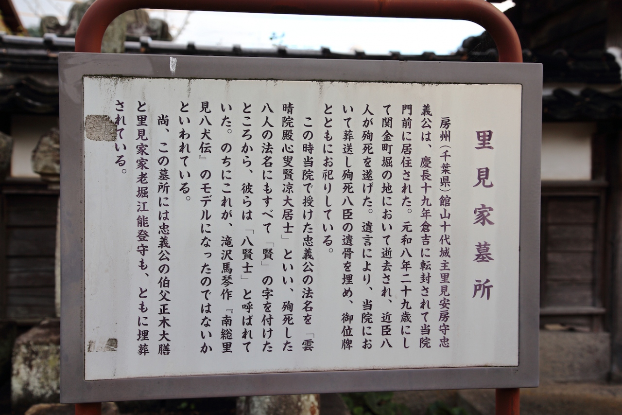 こちらは元々は米子藩中村家家老の菩提寺として建立されたお寺だったようで、里見家との縁は無かったようです。それが、里見家最後の当主である里見忠義公が因幡に流されて没した後、墓所として利用されたようです。このとき、家臣8名が殉死し、全員の戒名に『賢』の字が付けられたことから八賢士と呼ばれるようになったみたいですね。それを滝沢馬琴が転じて八犬士とし、有名な南総里見八犬伝として創作したようです。