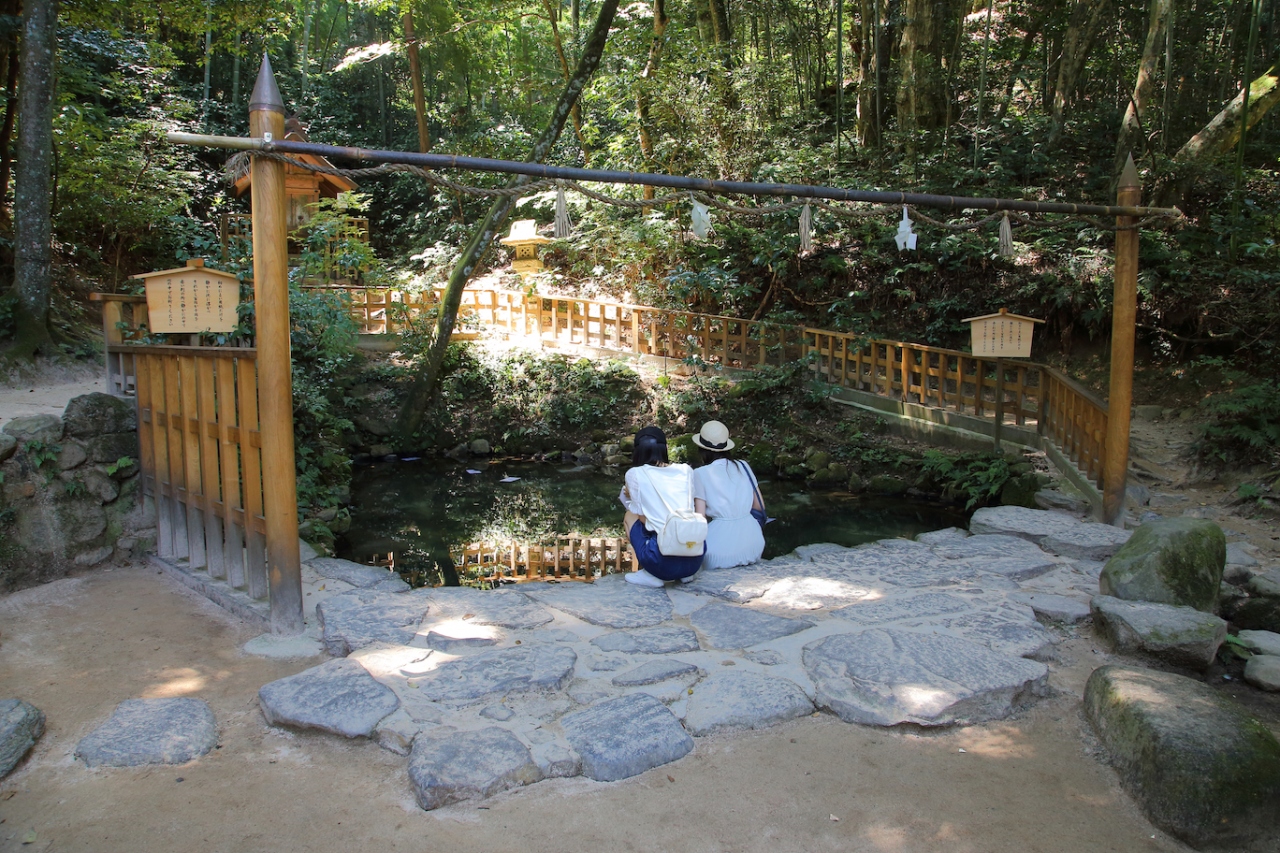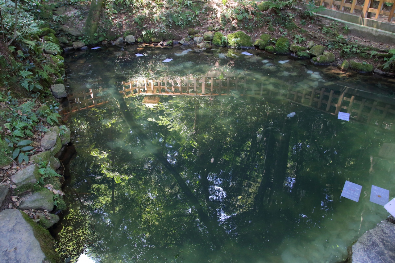 境内は社殿の建っているところと奥の院に別れていて、奥の院には縁結びの占いで有名な鏡の池があります。どんな占いかというと、社務所で買った用紙を鏡の池に浮かべ、10円玉を置き、沈む速さで婚期が何時頃になるか判る、というものです。何処まで当たるのかは判りませんが、若い方は皆さんやっていましたね。