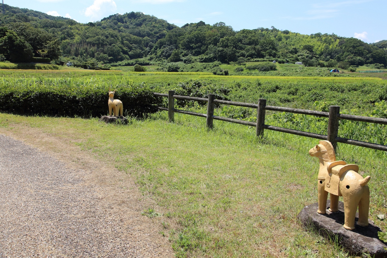 基本砂利道で、車が通れるほどの幅はありません。なので、歩くか自転車で通る道なのだと思います。配置されている埴輪は当然新しく作られたものなのですが、いろいろあるので見ているとユーモラスで面白いです。また、道の途中には休憩所もありますし、田圃や農業用の溜池なども見ることが出来ます。散策する道としては、結構面白いところだと思います。