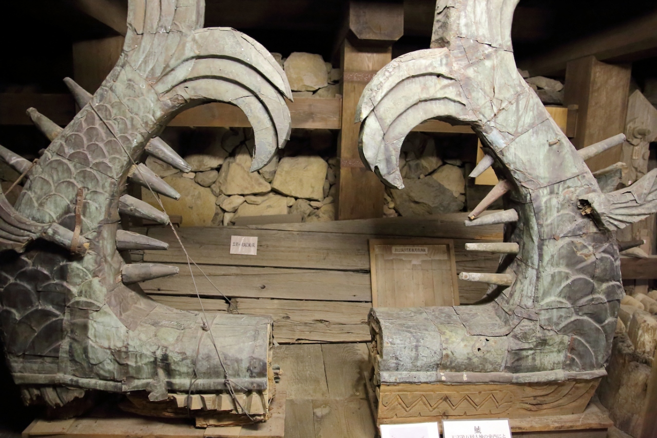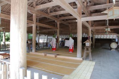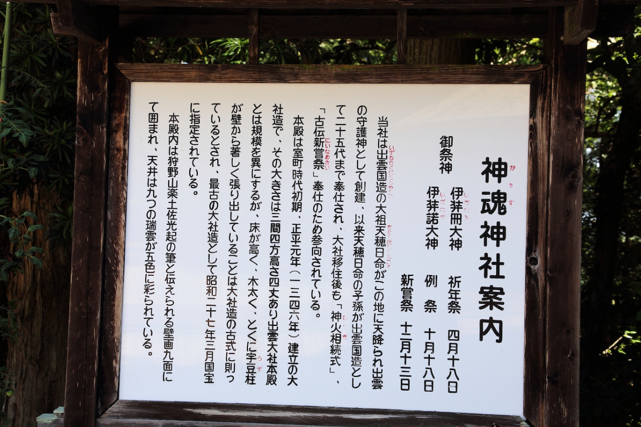 この神社は、素盞嗚尊が稲田姫命を八岐大蛇から隠した場所であり、結婚後は宮殿を建てた場所に建てられているのだそうです。まぁ神話時代の話ですから何処まで本当か判りませんが、由緒があるだけあって、社殿はとても立派なものです。ただ、社殿は新しく建てられたもののようで、立派ではありますが、歴史の重みはあまり感じられません。こちらで見るべきは、嘗ての本殿に描かれていた古い壁画です。宝物館に保管されており、有料ですが見学することが出来ます。この壁画自体は相当古いもののようで、一見の価値はあります。