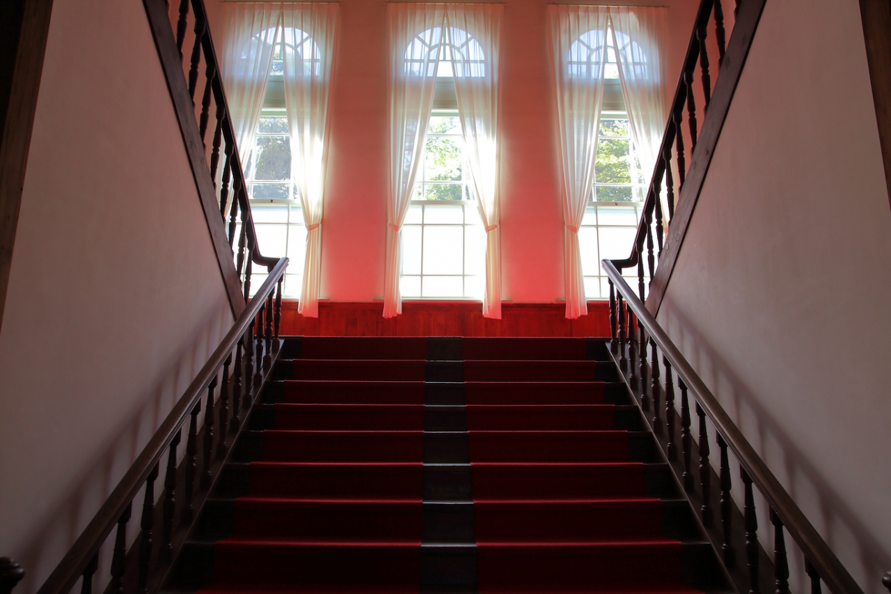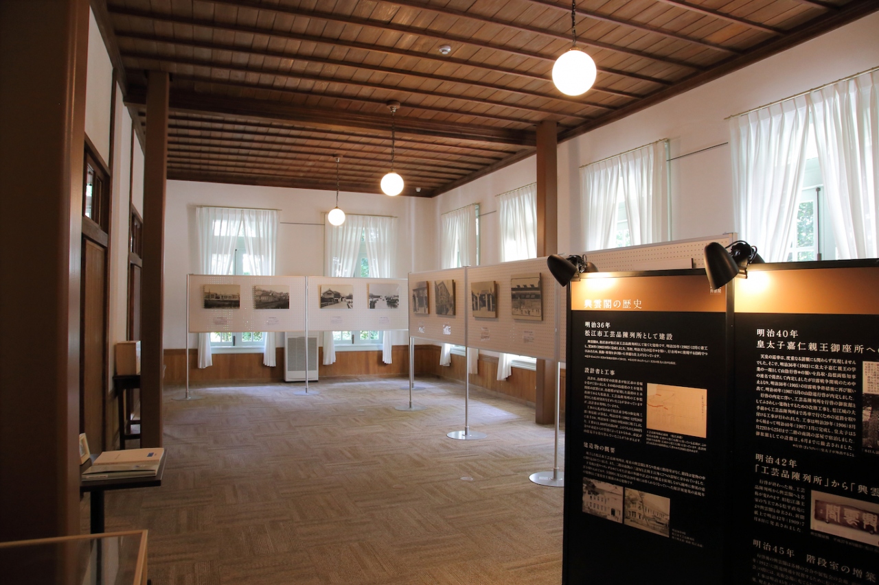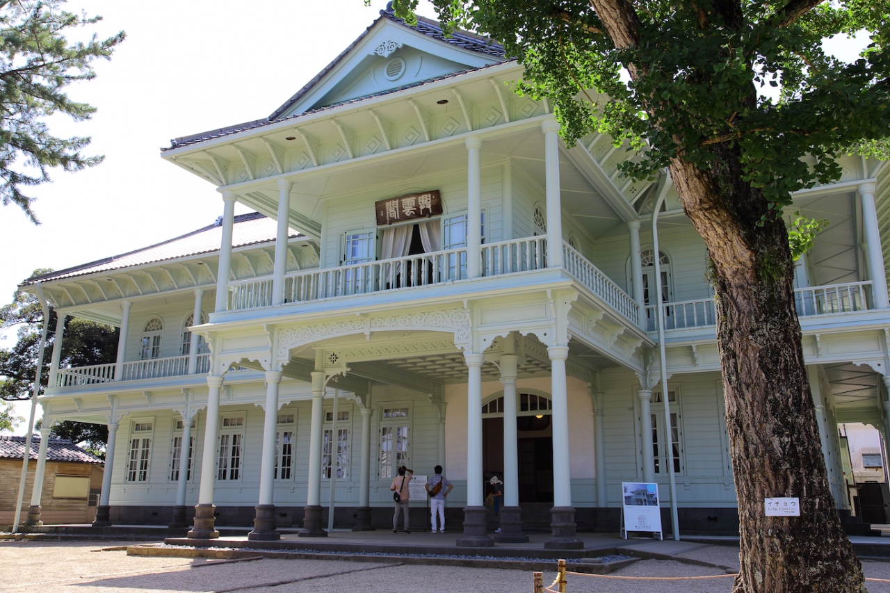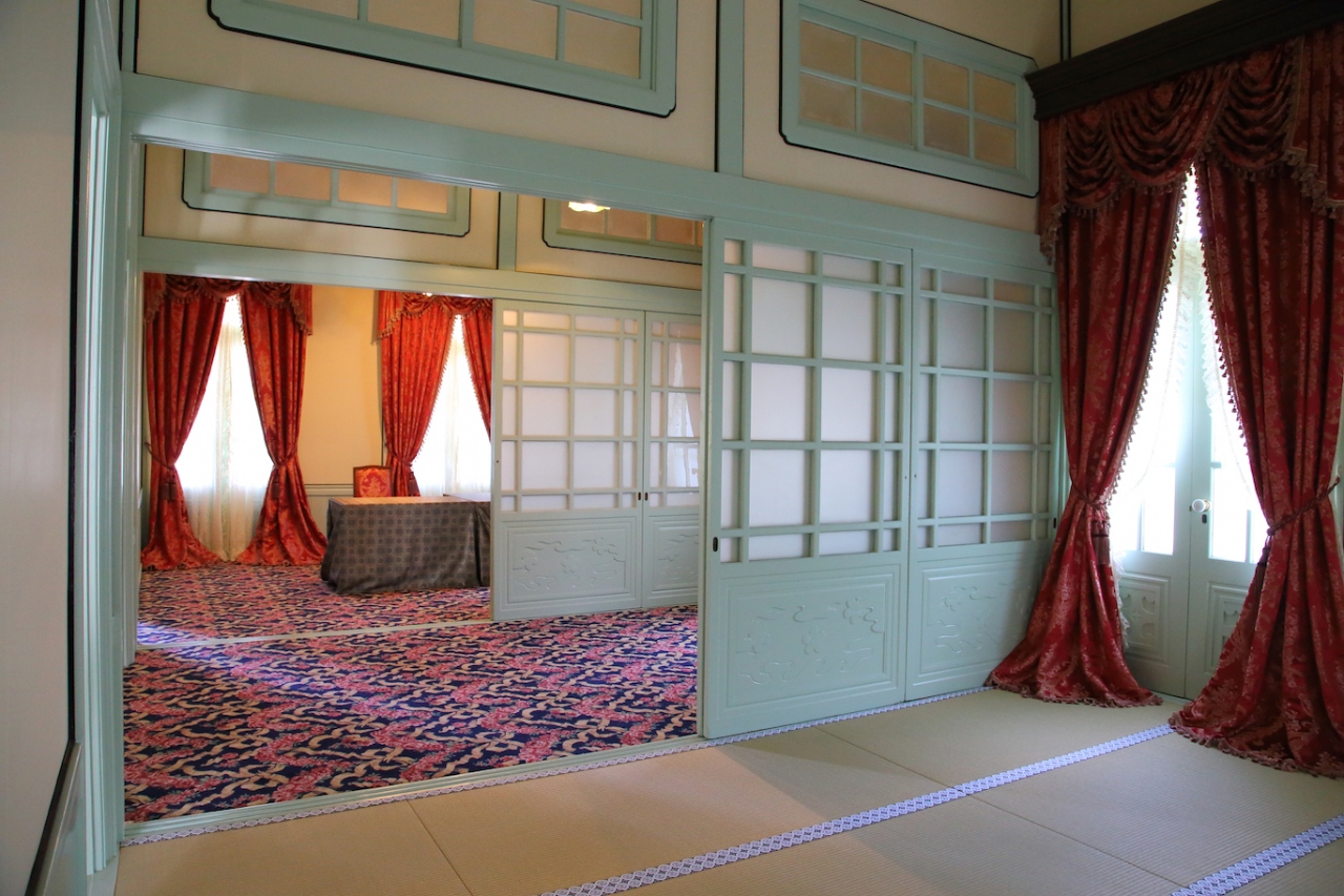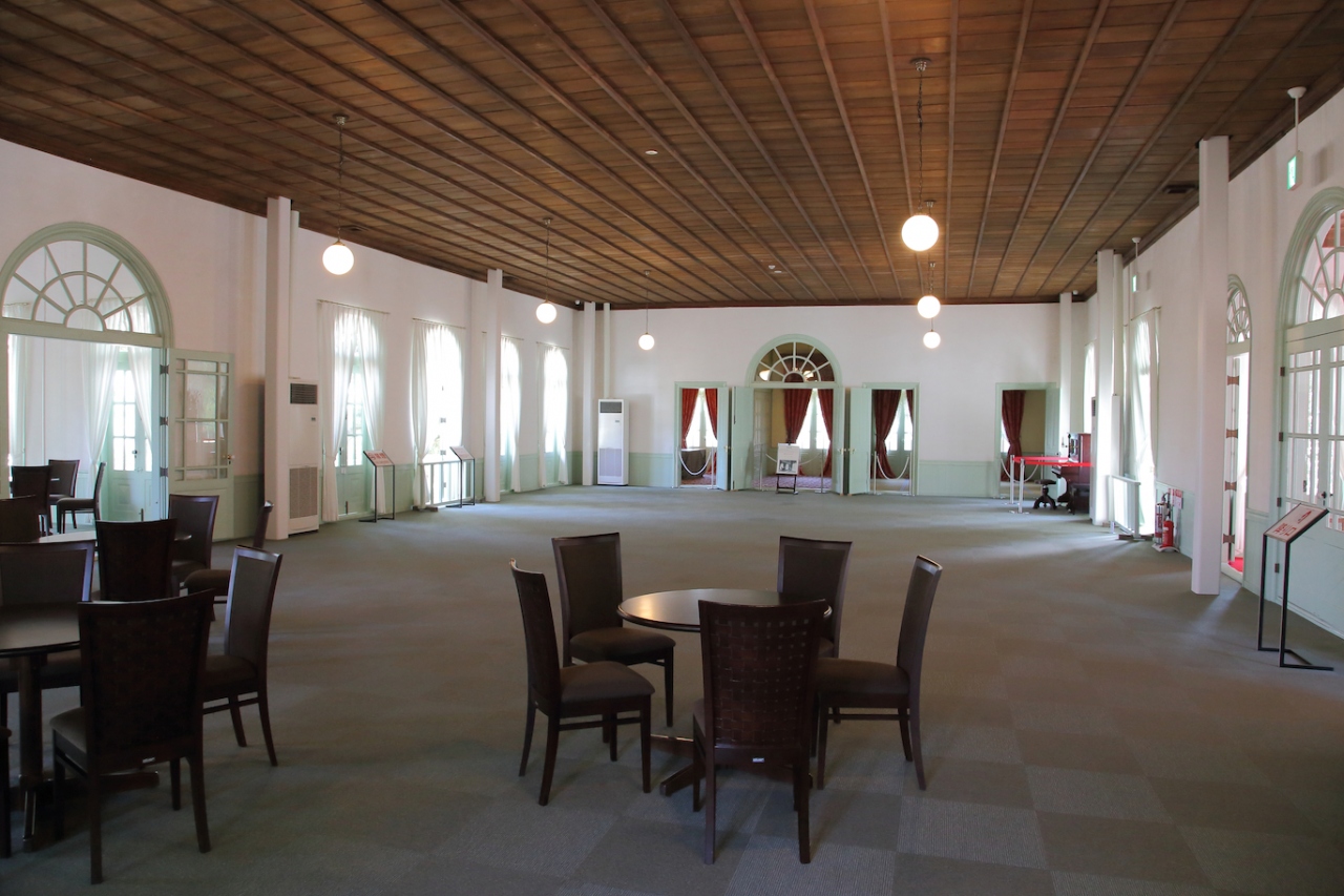 外見は水色で塗られており、円柱で囲むような形になっています。お隣の鳥取にある仁風閣がシンプルな外見だったのに比べ、意匠的に結構凝っている印象です。ただ、内部はシンプルな作りになっていて、1階には展示スペースとカフェ、2階には大広間と貴顕室があるだけです。内装もあまり凝っていません。この辺は仁風閣の方が凝っていますね。