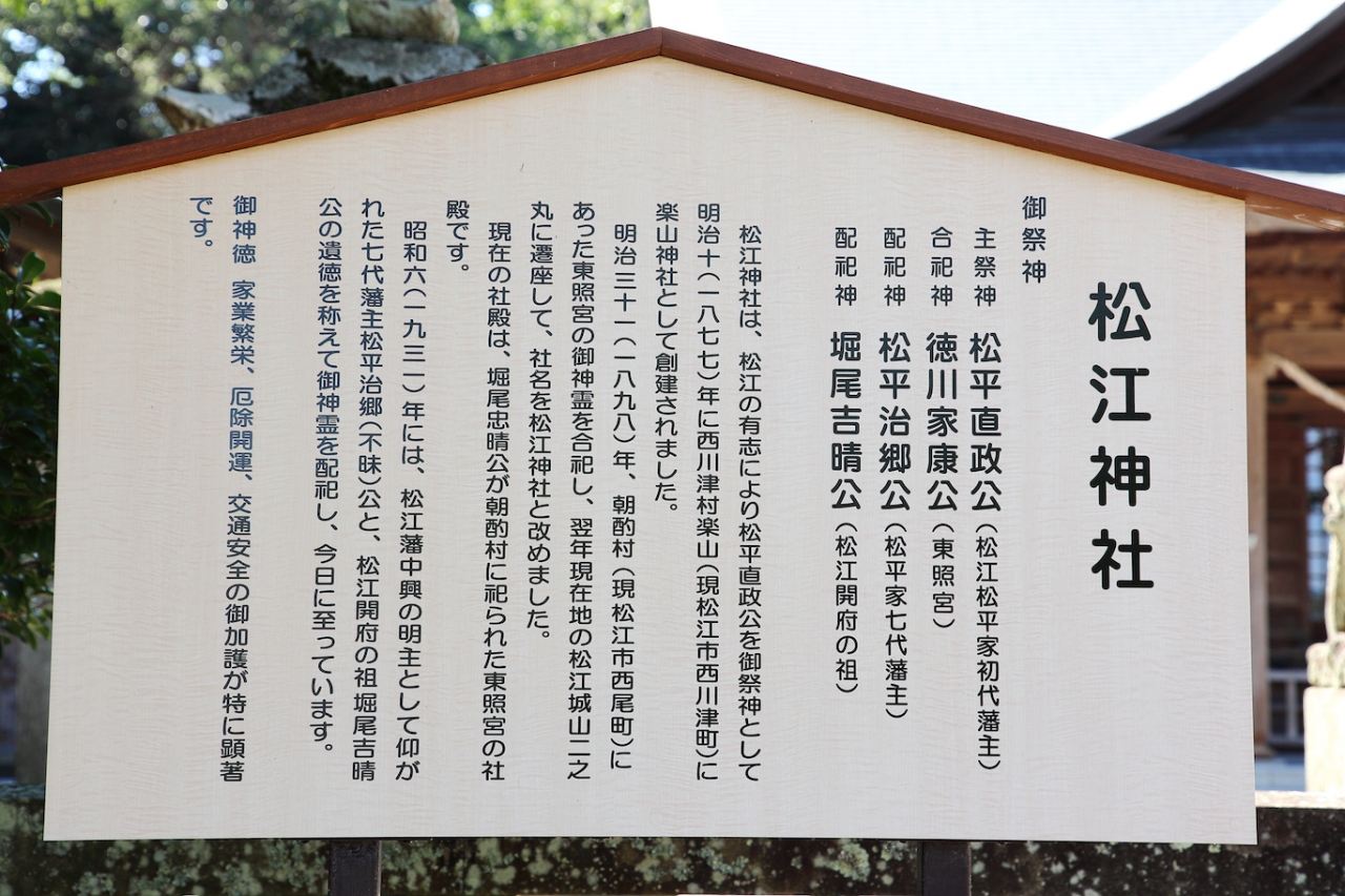 こちらの神社は明治期に旧松江藩の有志によって建てられたものらしく、歴史的にはさほど古いものではありません。祭神も松平直政公、徳川家康公、堀尾吉晴公、松平不昧公と、名君と謳われた方ばかりです。何となくですが、往時の幕政期を懐かしんで建てたのかな、という感じがしました。