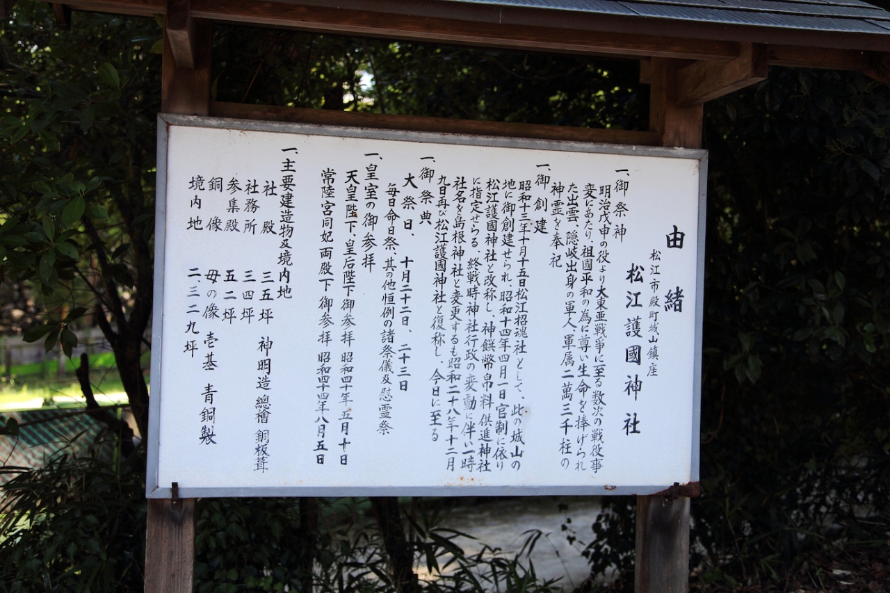 護国神社は東京と神奈川以外の地域では、必ず1県に1つは建てられています。で、お城が残っている場合、お城の敷地内に建てられていることが多いですね。この松江護国神社もそうですし。目的は地域から出た戦死者や、地域の自衛官、警察官、消防官などを祀る為なので、お城という場所が相応しい、という考え方なのでしょうか。