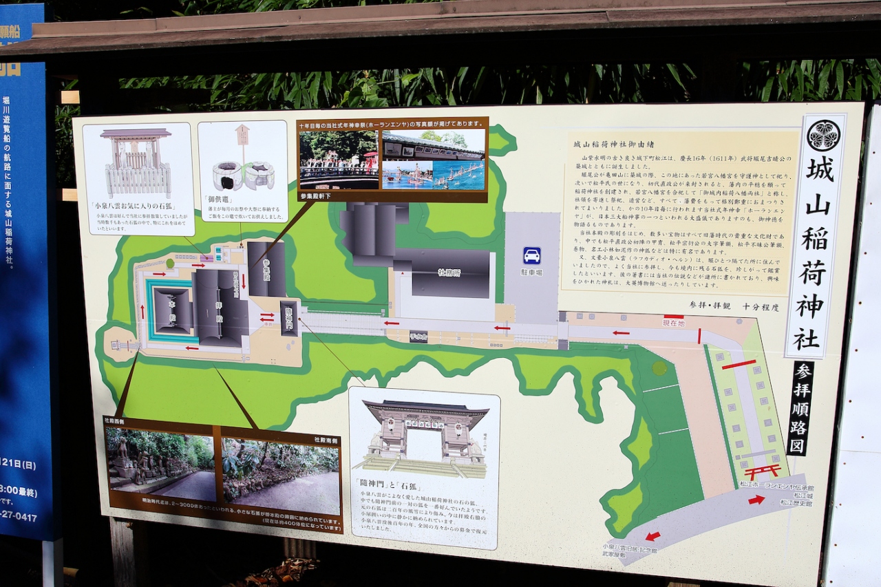 松江城内に建てられている稲荷神社です。創建は江戸初期まで遡るようです。言い伝えでは、松江松平氏初代の松平直政の夢枕に美少年が立ち、自分は狐の化身であり、城内に自分を祀ってくれるなら城と城下町を災厄から守る、と言ったそうです。それを聞き、このお稲荷さんを建てた、という話が残っています。まぁ、事実かどうかは判りませんが、松平氏が入城した際に立てられたのは事実のようです。