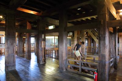 山陰では唯一の現存天守です。内部は地上5階、地下1階の6層構造になっています。附櫓から中に入るようになっていますが、入った場所が地下1階で、井戸や鯱が展示されています。そこから天守まで上っていくわけですが、他の現存天守同様に階段の傾斜がキツいです。昔の人はよく上り下り出来たな、と感心します。内部には武具や甲冑、松江城の縄張り、松江築城に関する資料が展示されています。他のお城と変わりません。