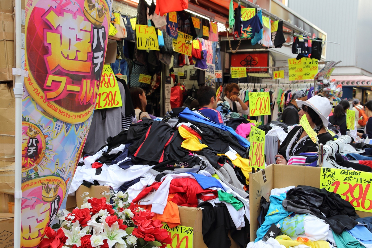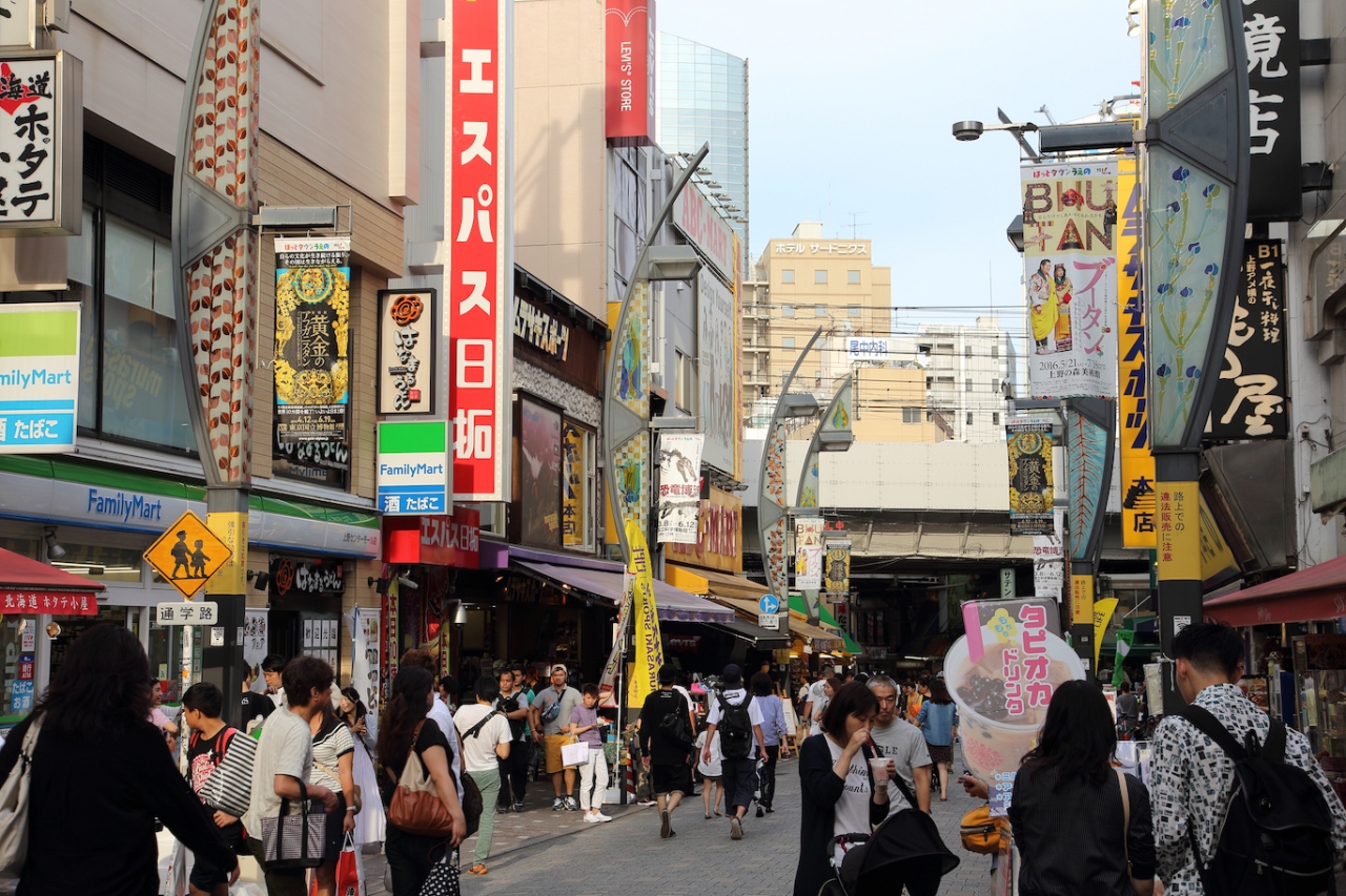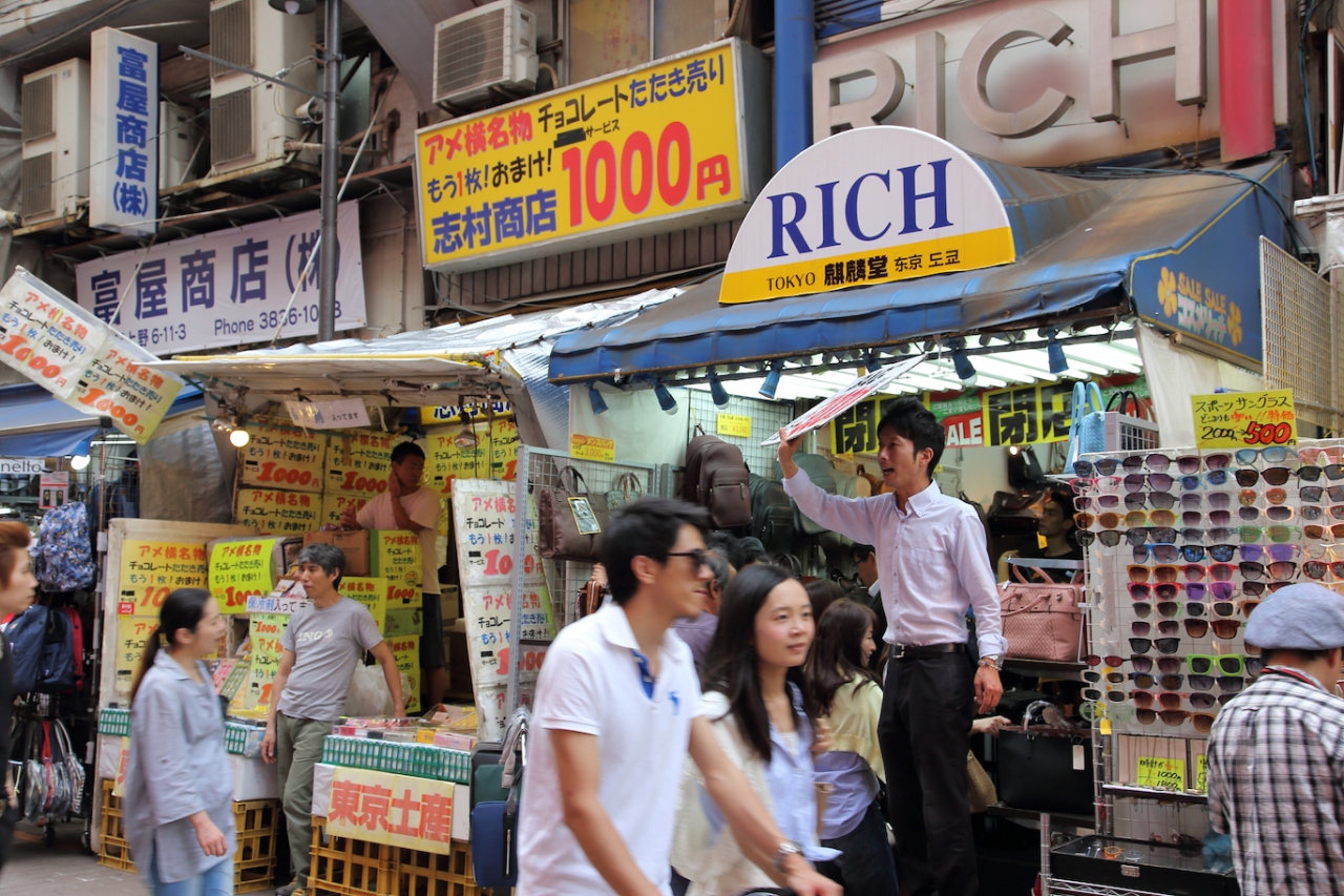上野駅正面のヨドバシカメラ脇から、御徒町駅までJR山手線の高架を挟む形で続く商店街です。年末に混み合う様子がテレビやラジオで放送されますから、誰でも知っている商店街でしょう。商店街の名前は諸説あるようで、米軍の横流し品を扱っていたから、とか、芋アメの問屋が多く居たから、とか色々あるようです。