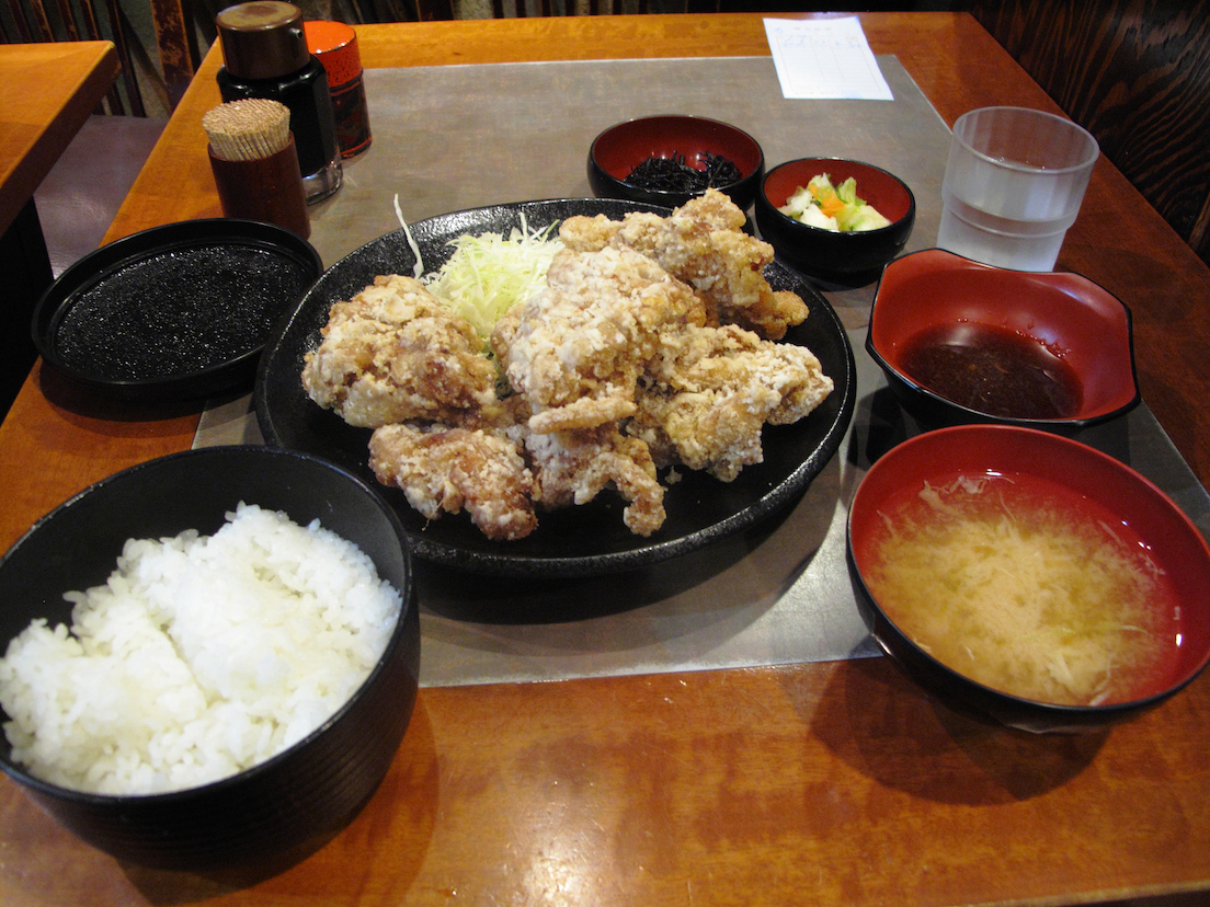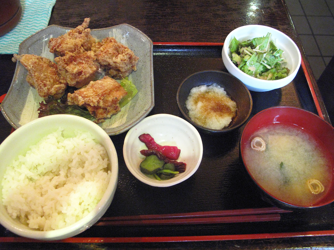 ここは唐揚げが有名ですから、当然唐揚げ定食を頼みます。唐揚げの数が2個から6個まで選べるので、5個を選びます。写真を見て貰えば判りますが、かなり大きな唐揚げです。ですので、5個を頼むとお腹一杯です。唐揚げは揚げ立てでサクサクしており、非常に美味しいです。こちらはご飯のお代わりは有料になるのですが、そんなことをしなくても充分満足できます。ランチ時間外で唐揚げが頼めるのかは判りませんが、唐揚げ好きなら是非一度行ってみてください。近所の室町店よりも空いていますよ。- 旅行時期