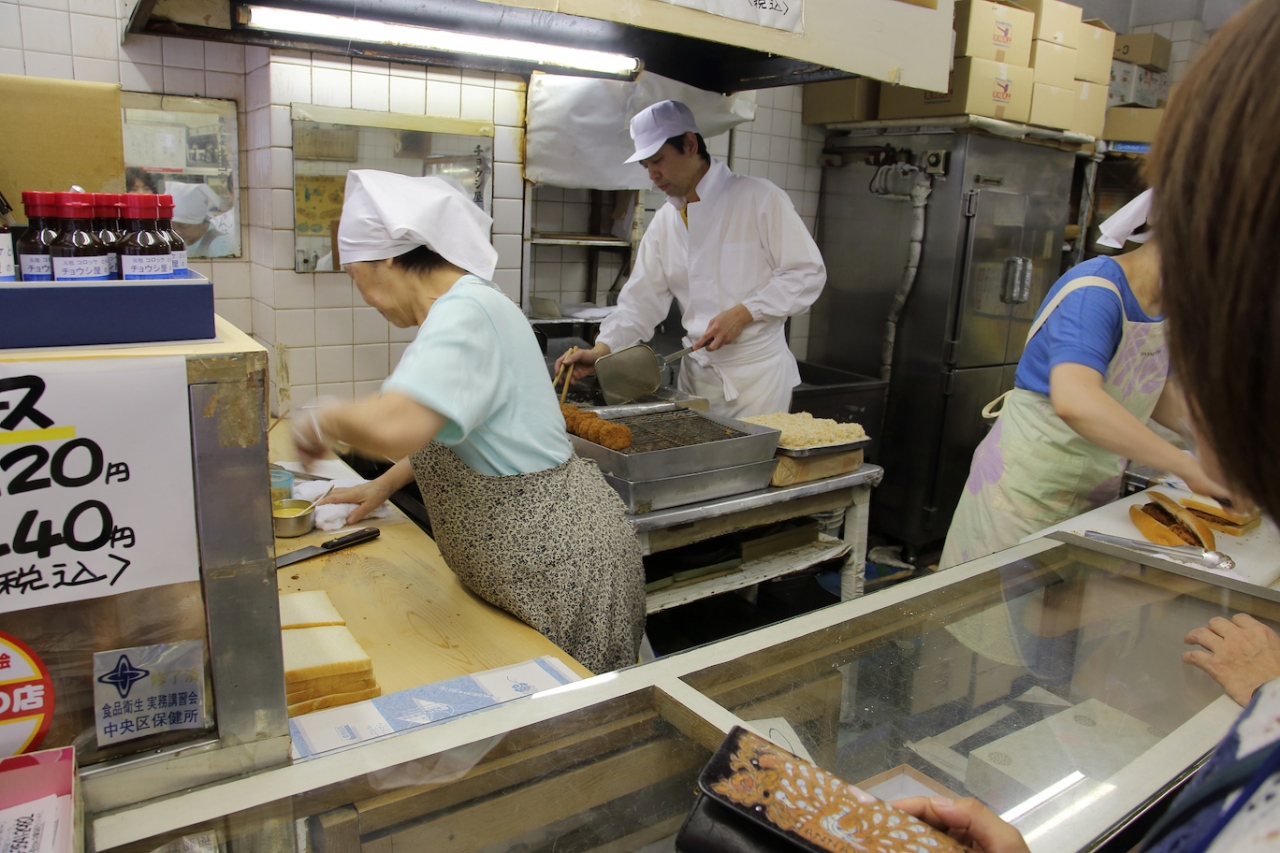 昭和2年創業のお肉屋さんです。ですが、現在はハムカツ、メンチ、コロッケ、トンカツの販売を専業としています。場所はちょっと判りにくく、昭和通りの1本東側の路地にあります。東銀座駅の3番か4番出口を出て、昭和通りを北に向かって歩いていくと吉野家が見えてくると思います。その吉野家がある路地を入り、最初の北に延びる路地に入ってください。そのまま北方向に歩いていくと、左手側にあります。