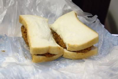 こちらではランチタイムに、前記の揚げ物を食パンかコッペパンに挟んでくれます。ハムカツを2枚とか、メンチを2枚とか、そういう注文も出来ます。なお、コロッケ2枚、コロッケとメンチはメニューにあります。