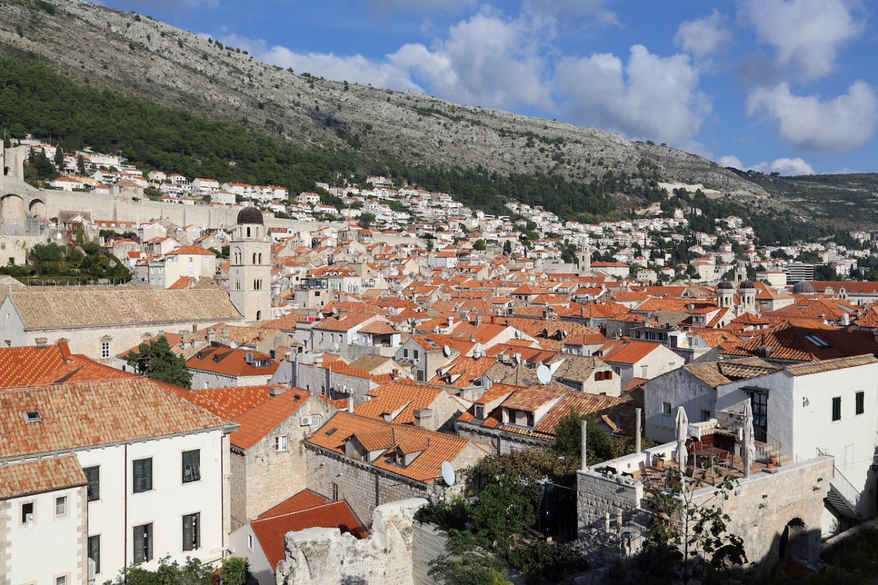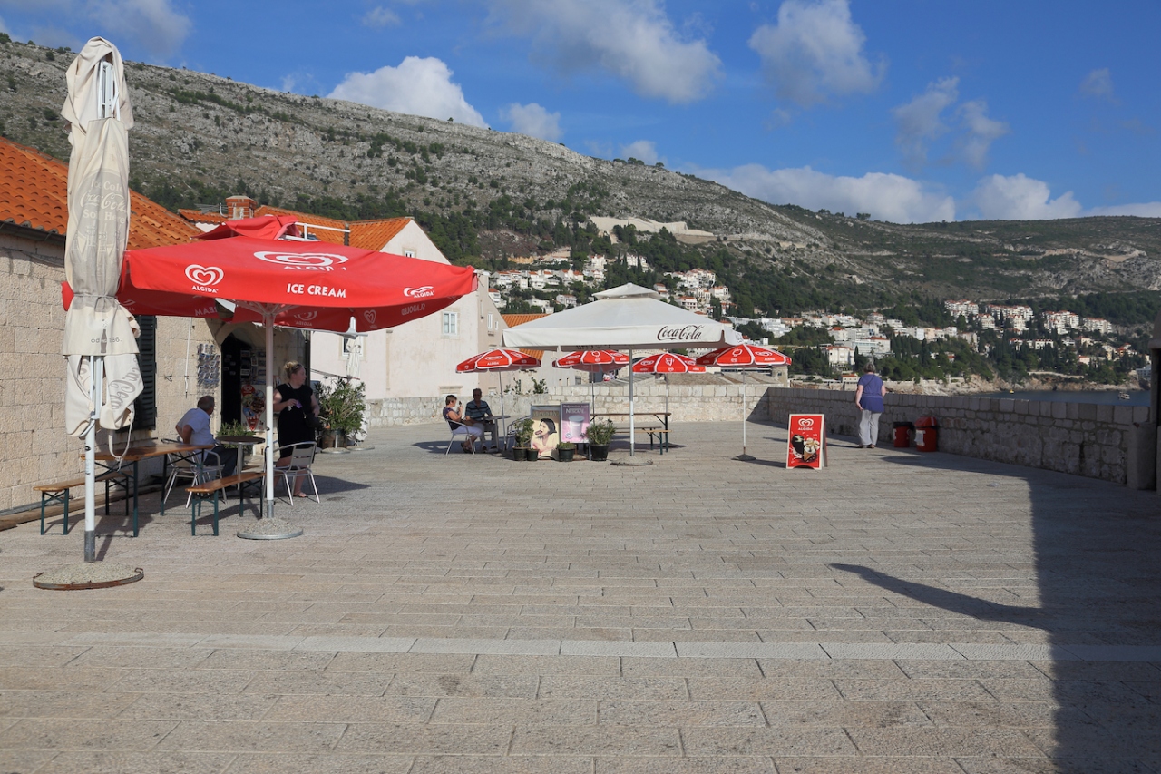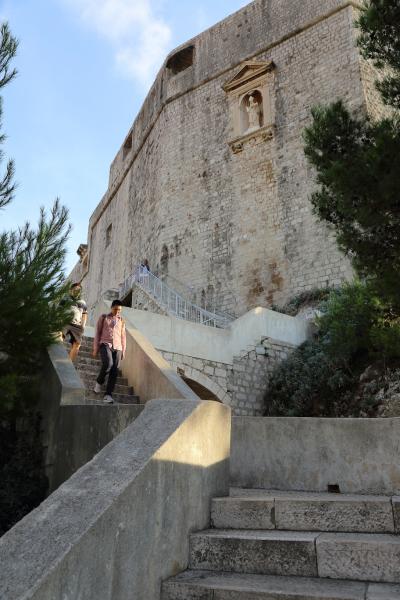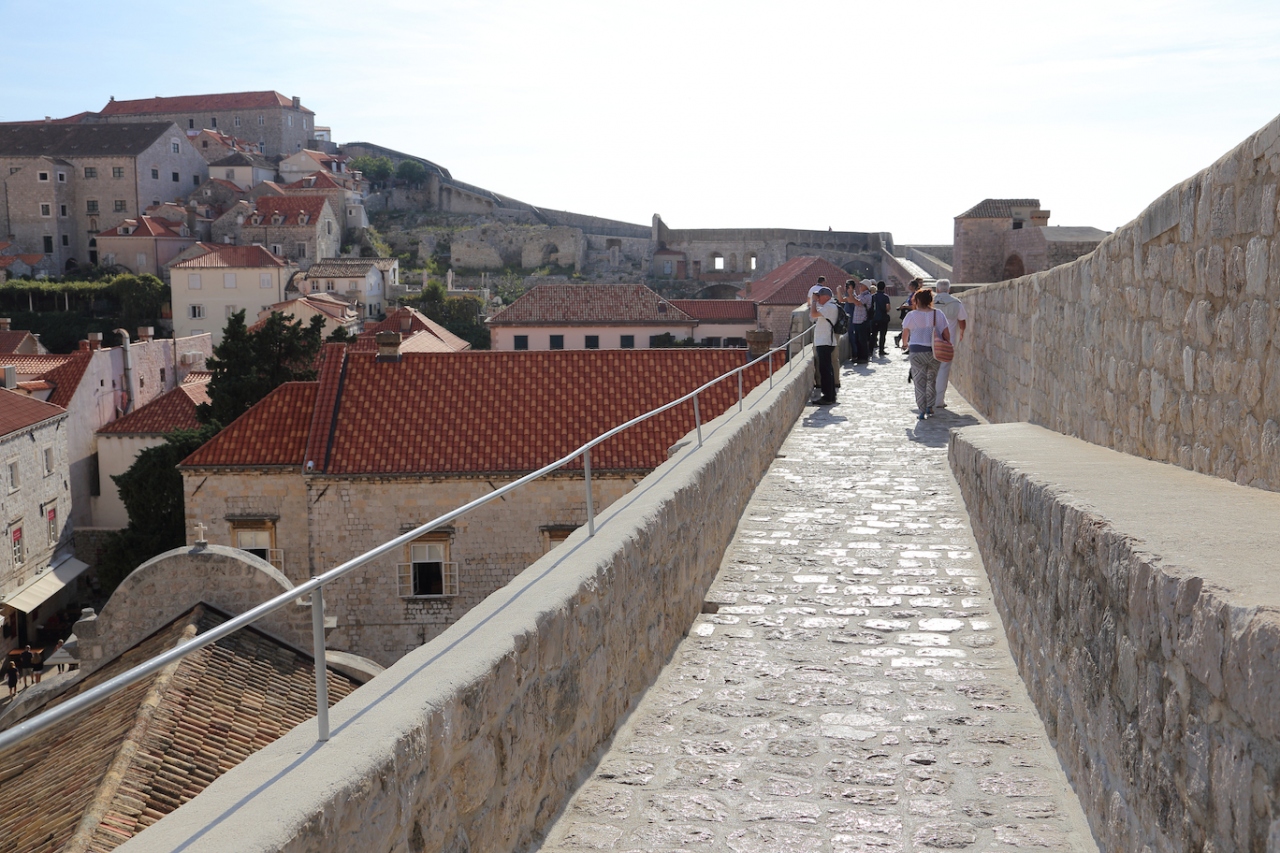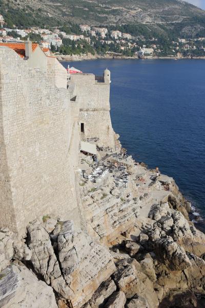 城壁に上ると旧市街が一望できるだけでなく、なかなか旧市街を歩いているだけでは見られない光景が見られます。岸壁のカフェで寛ぐ方や、カヌーツアーでアドリア海を漕いで行く方、内戦で破壊されたのかも知れない建物と修復している方、旧市街に住む方々の生活など…。単に旧市街の綺麗な眺めを見るのも良いですが、そういうものを見ると、より一層旅が面白くなりますし、旅の幅が広がると思います。その点で、城壁めぐりはお勧めです。なお、城壁の途中途中にカフェがありますので、疲れたら無理せずに一服することをお勧めします。- 旅行時期