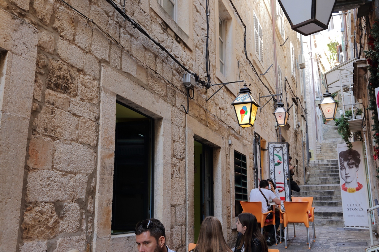 プラツァ通りから北に伸びる路地の一角にあるデザート専門店です。プラツァ通りに面しているわけではないのでちょっと判りにくいですが、プラツァ通りに看板が出ていますから注意して歩けば直ぐに判るかと。看板の場所から路地を覗けば店名とアイスクリームが書かれた街灯と、幾つかのテーブルと椅子が並んでいます。お店の入口はちょっと坂を上ったところになります。