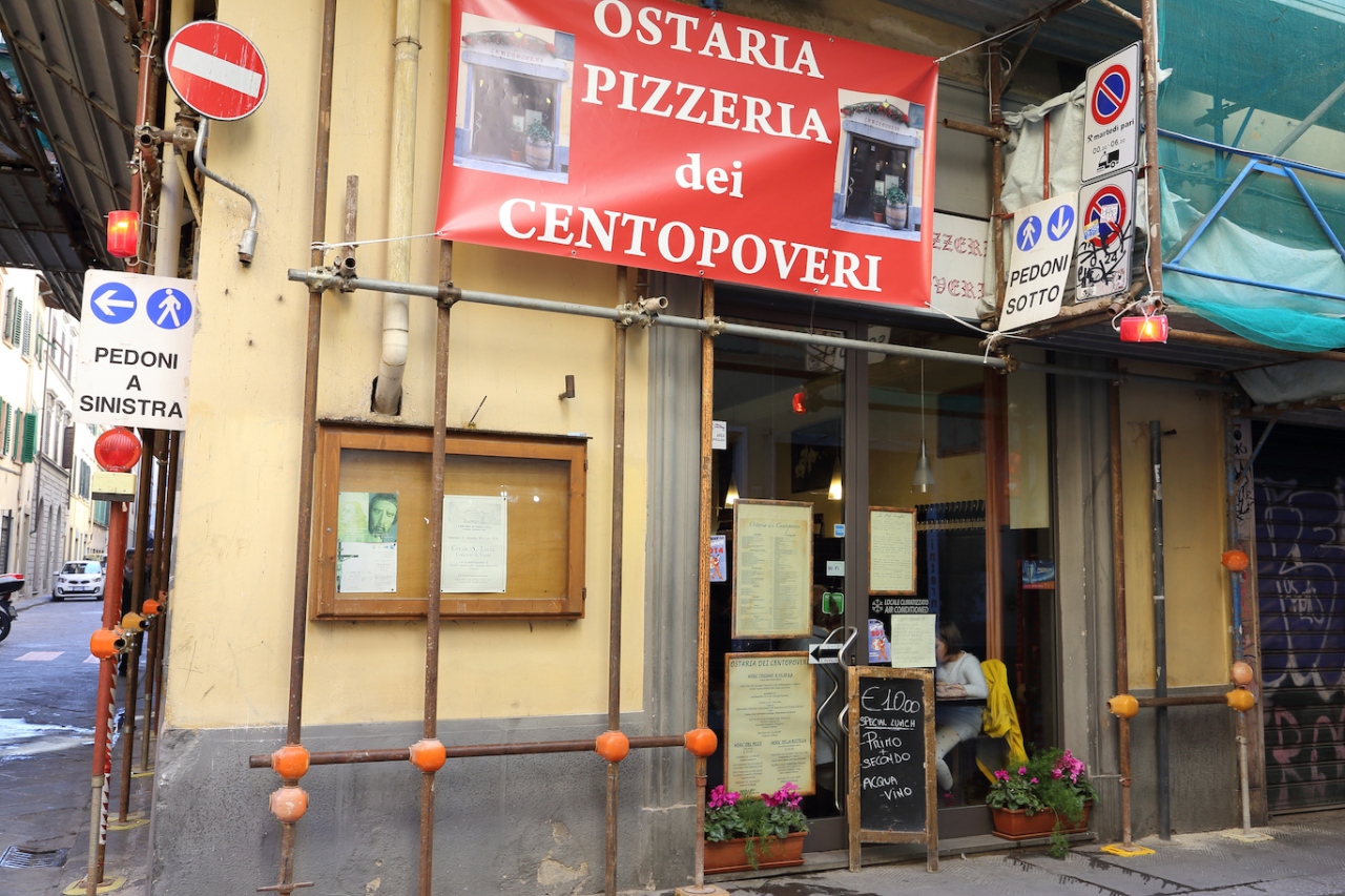 フィレンツェの旧市街にあるレストランです。このレストランがある辺りは下町で、華やかなドゥオーモ周辺やヴェッキオ宮付近と異なり、職人さんが多く住む地域です。なので、ちょっとごみごみしていますが、その分価格的にお手頃な店が多く並んでいます。場所は少々判りにくく、サンタ・マリア・ノヴェッラ薬局がある通りをサンタ・マリア・ノヴェッラ広場方面に向かい、途中でポルチェッナーラ通りを右手に曲がって真っ直ぐ行くと看板が出ています。