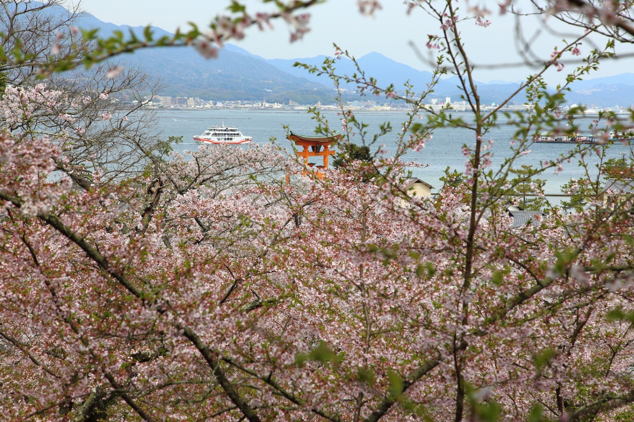 宮島は厳島神社が有名ですが、春は桜、秋は紅葉の名所でもあります。ただ、島全体が桜色に染まるわけではありません。また、桟橋から表参道商店街、御笠浜、厳島神社、という主要スポットだと回るとあまり桜を楽しめません。