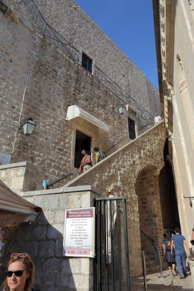ドゥブロヴニクの旧市街は城壁でぐるっと囲まれていますが、この城壁を歩いて一周することが出来ます。距離は2Km程度ですがアップダウンがかなりあるので、体力に自信の無い方はゆっくりと散策すると良いでしょう。城壁の入口はピレ門そば、海洋博物館入口付近、ドミニコ修道会東側の城壁上にあり、どこからでも入れますが、順路は一方通行です。また、3つの入口で必ずチケットを確認されます。ですので、チケットは無くさない様にして下さい。なお、ドゥブロヴニクカードを持っていると、城壁は無料です。城壁のほか、博物館を2、3回れば元が取れますので、城壁へ行く場合はカードの購入を検討しても良いかと。