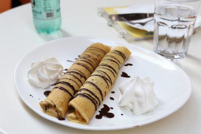 こちらはアイスクリームが有名なようですが、メニューに書かれたクレープが美味しそうだったのでチョコバナナクレープを頼みました。で、出てきたものを見ると、もの凄いボリュームでした。まるごとバナナ、というヤマザキの商品がありますが、あれ2つ分のくらいの量で、加えて山盛りのホイップが添えられていました。味は大変に美味しく、城壁巡りの直後だったということもあり、あっというに平らげてしまいました。ただ、おやつ代わりに食べるにはちょっと重いかも知れません。観光地ということを考慮しても値段はリーズナブルですし、一休みするには最適の店と思います。店員さんは女性ばかりで親切でしたよ。- 旅行時期