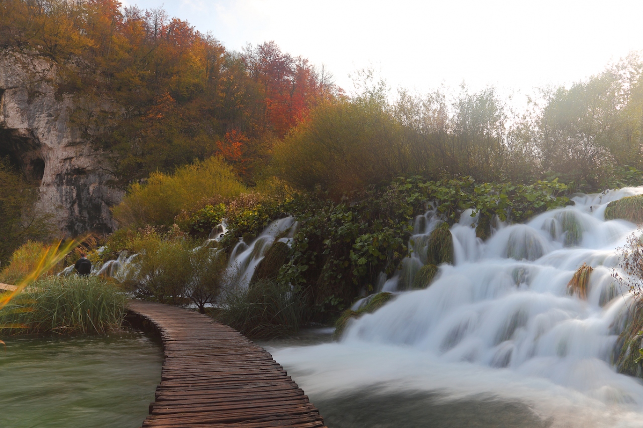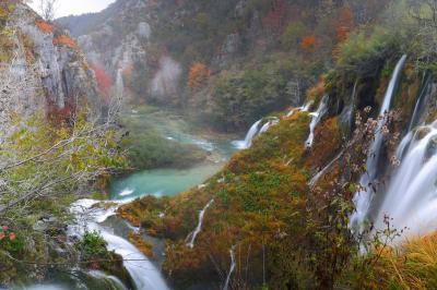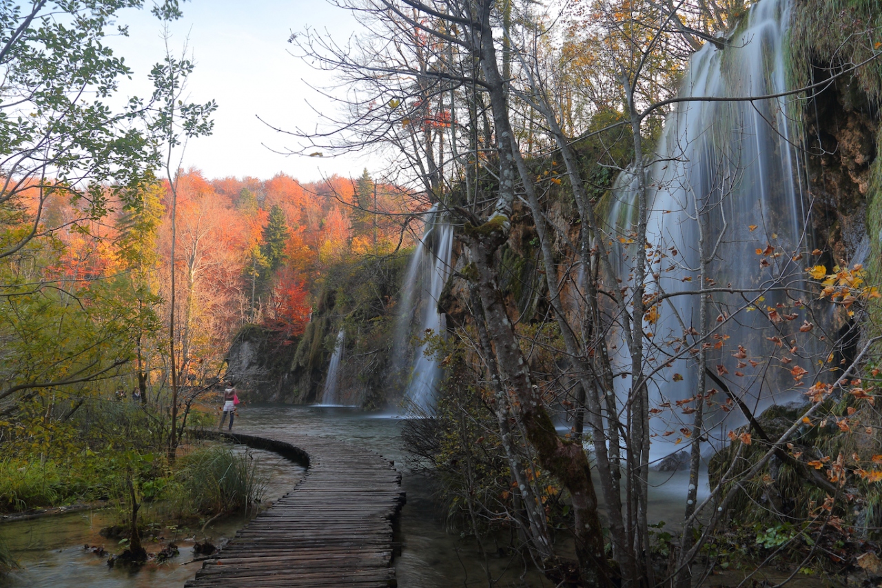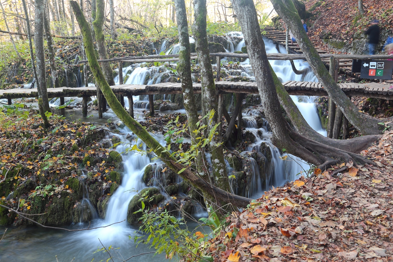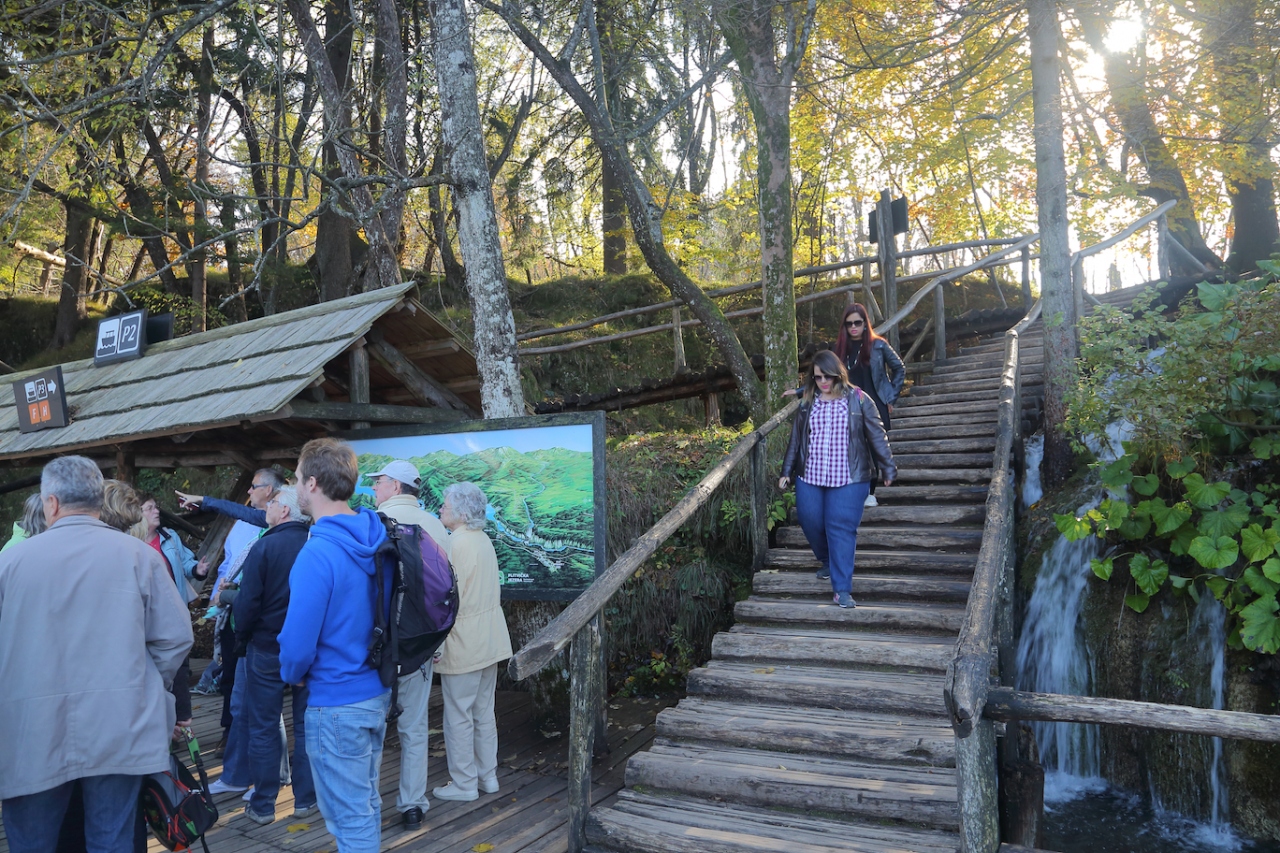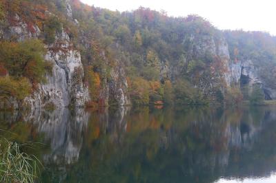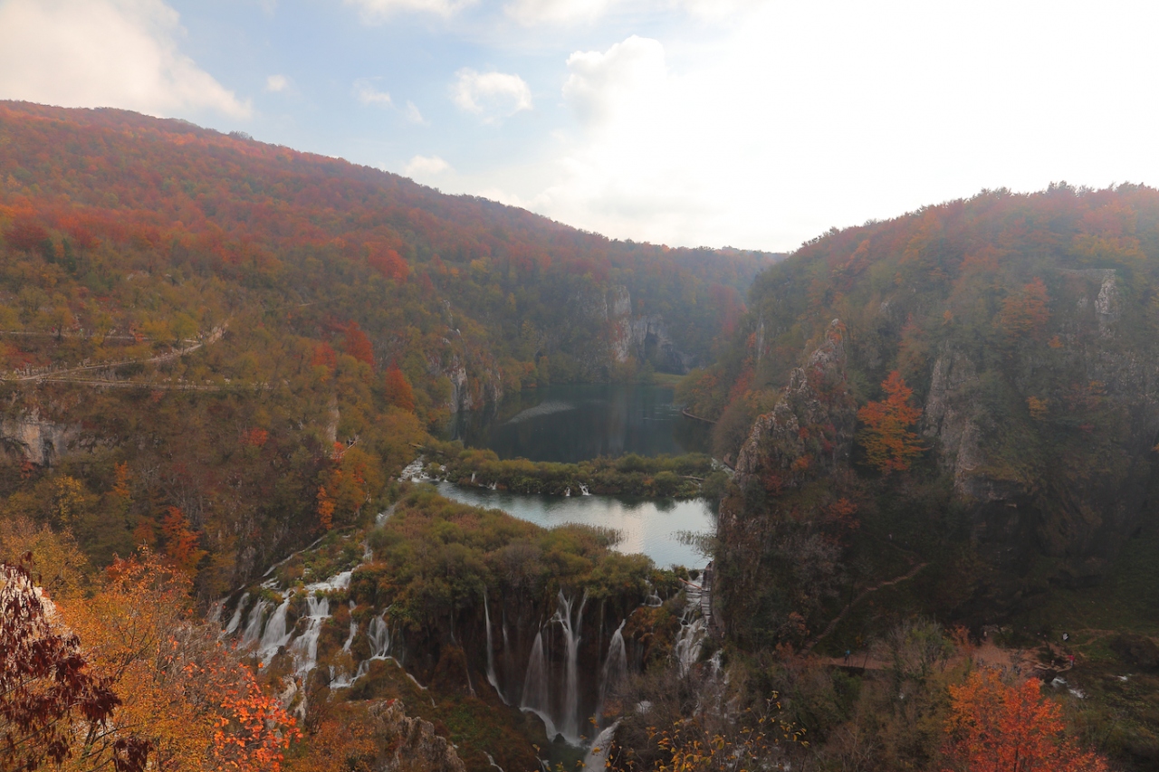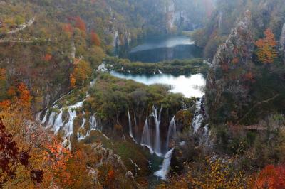 ガイドブックやパンフレットで使われている写真は、下湖群のものが多いです。園内最大の滝であるヴェリキ・スラップも下湖にありますし、カルジェロヴァツ湖とカヴァノヴァツ湖の間の遊歩道も下湖です。ガイドブックに乗っている光景が見られる展望スペースも下湖にあります。ですので、景観は素晴らしい場所が多いのですが、紅葉はあまり楽しめません。ただ、時間が無い場合は下湖群だけを見て周っても十分に楽しめると思います。1つだけ注意事項としては、景観が良いということは、それだけアップダウンが多いという事です。実際、展望スペースに行く時や、遊歩道を見下ろす場所に出るときには階段や洞窟の中を上っていくことになります。手摺りが着いている場所もありますが、結構自己責任、と描いてあるところも多いです。注意してください。- 旅行時期