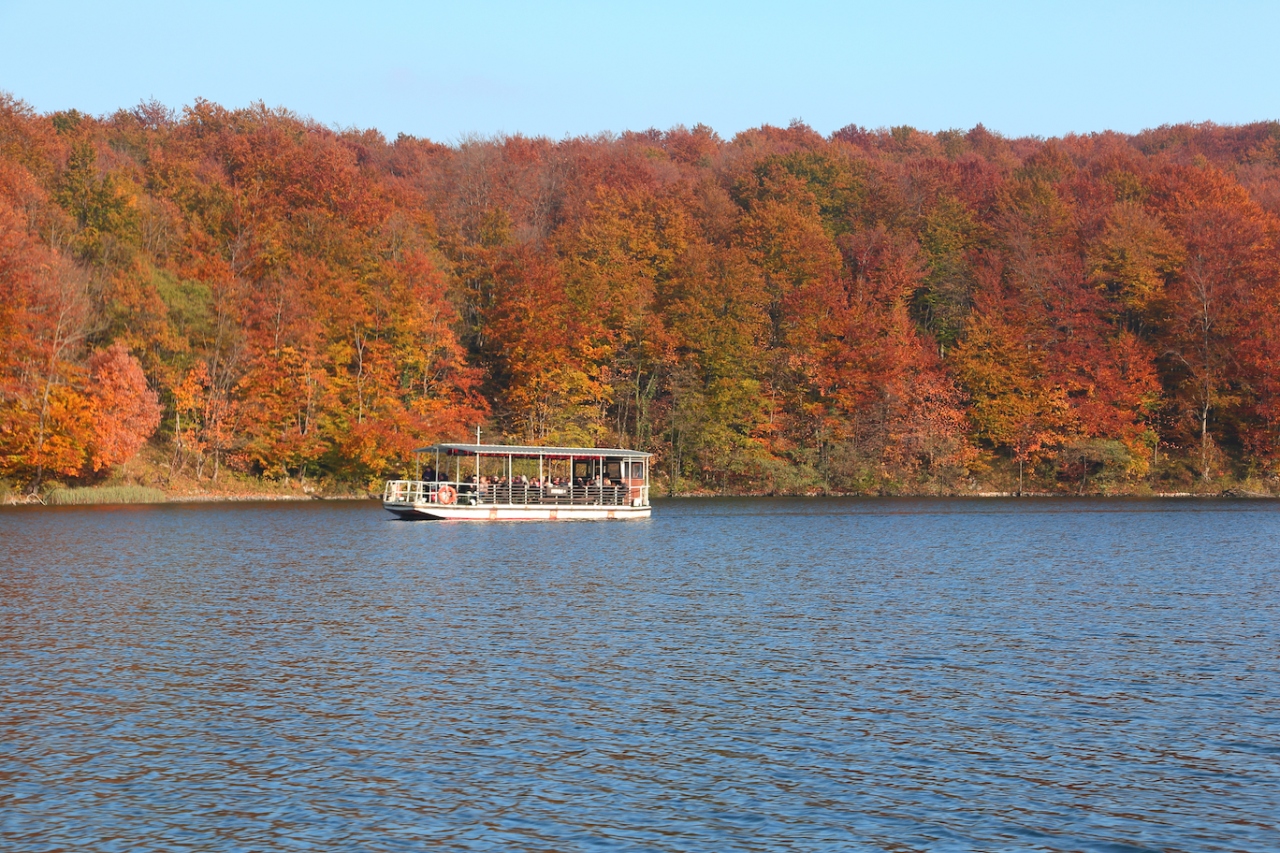 こちらの湖にはボートが運航されていて、そちらを使って渡るのが一般的です。個人的にもボートを利用することをお勧めします。湖の周囲に遊歩道も整備されているのですが、あまり眺めが良くありません。ボートなら、湖の上から周囲の景観を楽しむことが出来ます。特に紅葉の時期だと燃えるような木々に囲まれた景色を堪能できます。私は10/26に訪れましたが、紅葉真っ盛りで素晴らしい景色を堪能できました。なお、P1−P2の間だけだとあまり景色を楽しめません。P2−P3の間を移動することをお勧めします。- 旅行時期