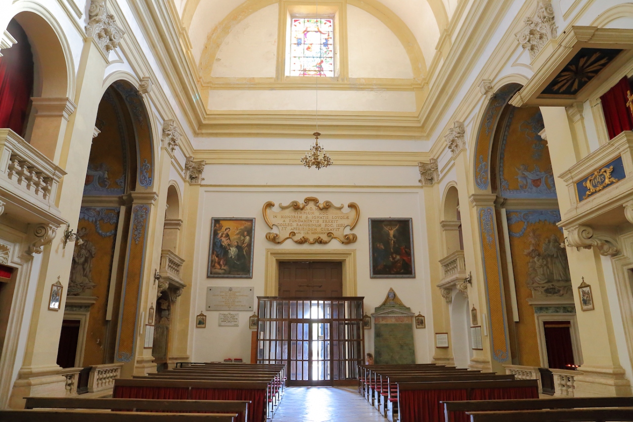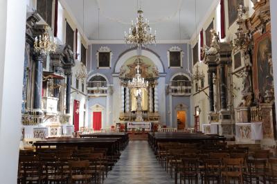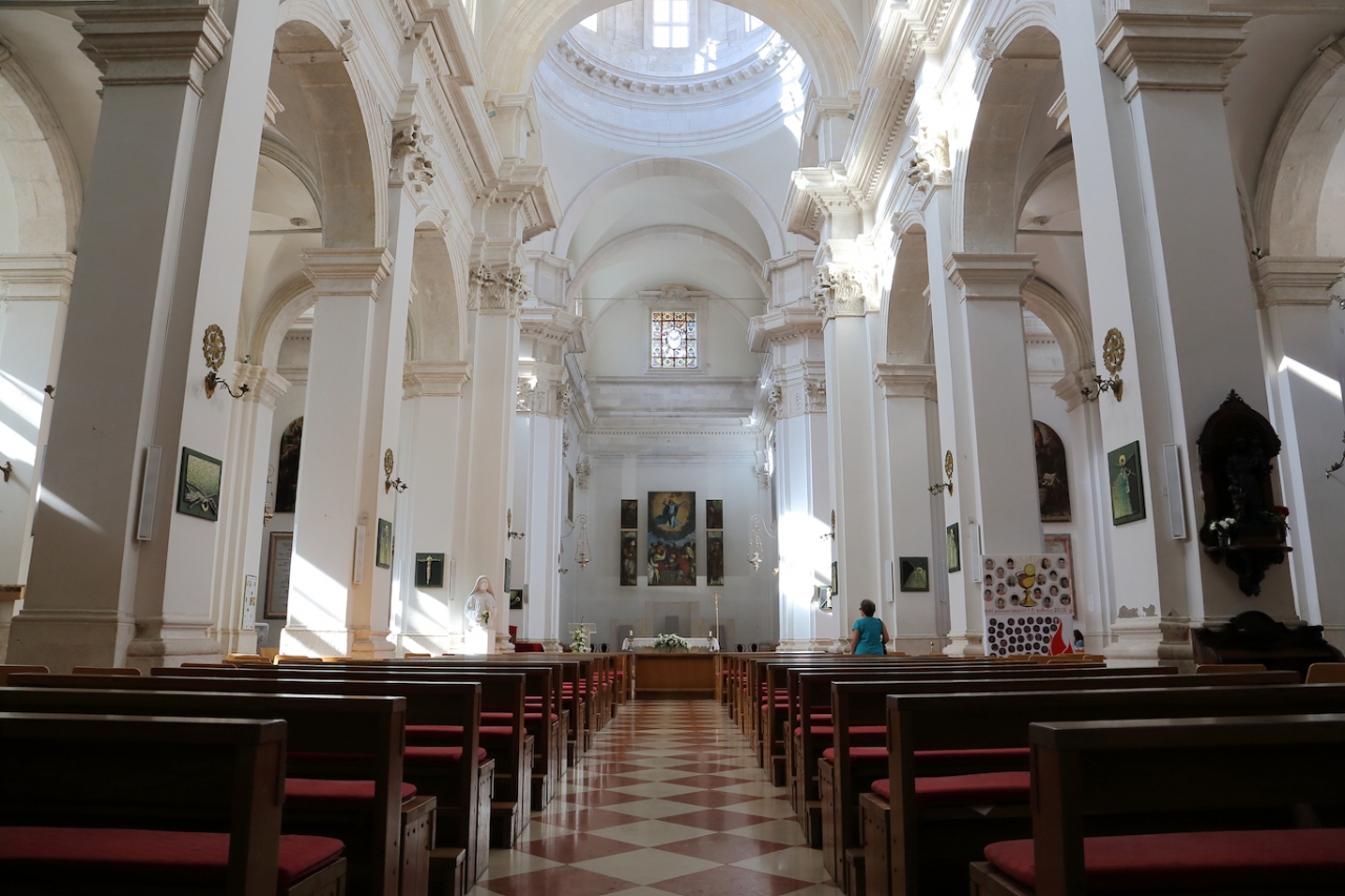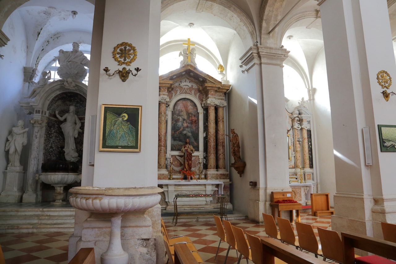 ガイドブックで聖母被昇天大聖堂と紹介されている教会です。ルジャ広場から南を向けば円いクーポラが見えますから、直ぐに判ります。内部は大聖堂に相応しくかなり広いです。ただ、側廊の礼拝壇はバロック様式の凝ったものですが、全体的には白を基調としたシンプルな装飾で、あまり目立つものはありません。