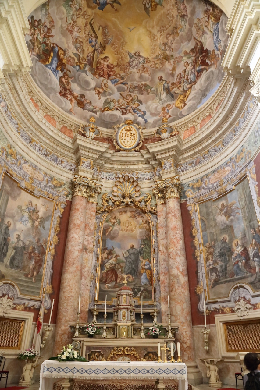 ファサードは簡素ですが内部は華やかで、バロック装飾で施されたチャペルと祭壇が出迎えてくれます。特に祭壇部分は天井全体にフレスコ画が描かれ、精巧な石造りの祭壇と相まって見応えがあります。町外れにある所為かツアー客も居らず、静かで荘厳な雰囲気でした。見る価値はあると思うので、時間が取れれば旧市街散策の途中に立ち寄ってみることをお勧めします。なお、写真撮影禁止とブログで紹介されたりしていますが、特にそのようなものは見当たりませんでした。ですが、たまたまだったかも知れませんのでご注意下さい。- 旅行時期