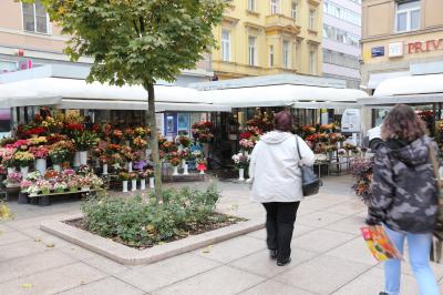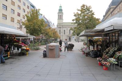 小さい広場ですが、中心街にある所為か周りにはカフェやレストランが並んでいます。どの店もテラス席をたくさん並べていますから、結構賑やかです。こちらの広場で特徴的なのは、花屋さんが多く並んでいることです。教会の門前にあるからかも知れませんが、こういった光景ははじめて見ました。