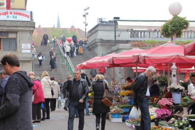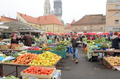 イェラチッチ広場の北側にある青空市場です。イェラチッチ広場から北に向かう通りを進むと赤い並んだ赤いパラソルと、その先の階段が見えると思います。その階段を上ってください。