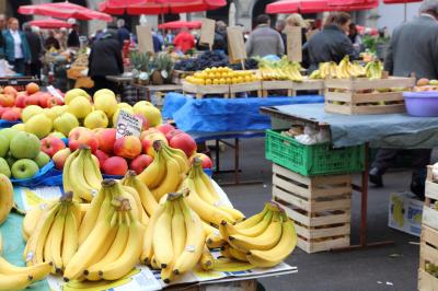 一番最初に目に飛び込んでくるのは青果ですが、左手側奥の建物には魚市場、正面奥の地下には生肉売り場があります。また、青果のところにはラベンダーや蜂蜜などの土産物もならんでいます。私が訪ねたときは曇って肌寒い天気でしたが、それでも多くの人がこちらを訪れていて、非常に活気がありました。ホテルに宿泊していたので食材は買いませんでしたが、アパートメントやホステルに滞在しているならこちらで食材を買って調理するのも面白そうです。なお、こちらの市場では周りのカフェの店員が、それぞれの露店の方にコーヒーの出前をしていました。普通、店番を残してカフェに行くのが普通と思いますが、こちらは逆のようです。結構面白い光景でしたね。- 旅行時期