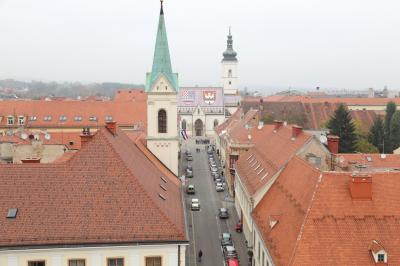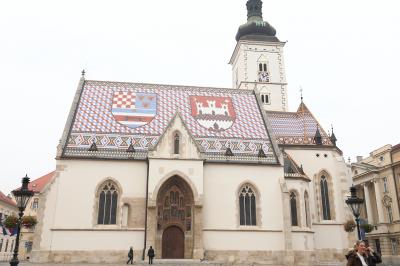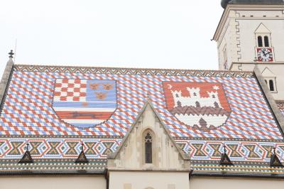ザグレブで一番有名な建物と思います。立派なのは聖母被昇天大聖堂ですが、こちらの教会の屋根の方が有名な気がします。ケーブルカーを降り、ロトルチュシャク塔の東側の通りを覗き込めば真正面に見えます。迷うことは無いでしょう。