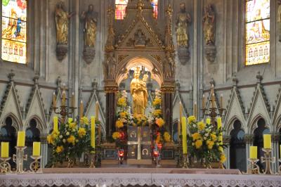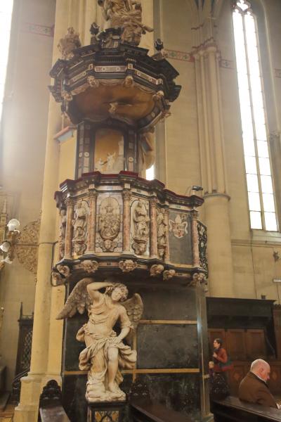中は大聖堂にふさわしく、立派なものです。リュブリャナの聖ニコライ大聖堂やウィーンのシュテファン大聖堂ほど派手ではありませんが、重厚な雰囲気です。左右壁面の礼拝壇も立派なものですし、翼壇の彫刻は素晴らしいです。祭壇は簡素ですが、奥のステンドグラスは大変に立派なものです。パイプオルガンも大きなものが設置されています。ランドマーク的な存在でもありますので、ザグレブに行くなら訪ねてみることをお勧めします。