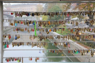 三本橋と竜の橋の中間にある、歩行者専用の橋です。橋の両端がガラス張りになっており、橋の上には芸術的なオブジェが飾られています。この当りは川沿いが遊歩道になっており、カフェが並んでいるので、その辺を意識しているのかな、と思いました。欄干にはお約束の如く南京錠が大量に掛けられています。