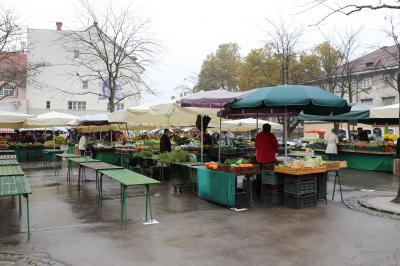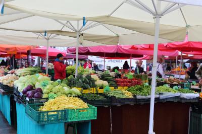市場は広場だけで開かれているわけではなく、リュブリャニツァ川南側のアーケードでも開かれています。広場には青果やバッグなどの日用品、アーケードには土産物が並んでいます。私が行ったときは昼近くで小雨も降っていましたが、そこそこ人がいました。きっと天気が良い朝の時間帯なら、地元の人が沢山居て活気があるのだろうと思います。観光地ではありませんが、地元の生活を垣間見れる、という意味で行ってみる価値はあります。こちらでしか売っていないものもありそうですから、土産物を探しても面白いと思います。- 旅行時期