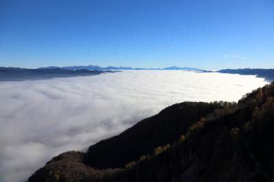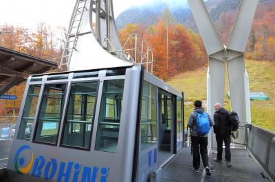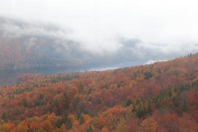 ボーヒン湖の紅葉を楽しもうと、10/24の朝一番に訪問しました。紅葉真っ盛りで、バス停からスキーセンターまでの道路もオレンジのトンネルになっていて、歩いているだけで非常にテンションが上がりました。これなら上からボーヒン湖をみれば絶景が楽しめるだろうと思ったのですが、雲海に覆われていて全く見えませんでした。観光案内所の方に聞いてみましたが、秋の午前中はボーヒン湖の上に雲が掛かるので、天気予報で快晴と出ていても雲海で見えないのだそうです。というわけで、湖と紅葉が一緒に楽しめるのはケーブルカーの中からだけで、雲海を抜けると全く見えませんでした。知っていれば午後に出かけたのですが、残念です。