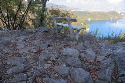 ブレッド湖畔の岸壁に建つお城です。行き方はいろいろあるようですが、歩いていく場合はブレッド湖の遊歩道に『GRAD』と書かれた看板が出ていますから、それに従って行けば着きます。ただ、坂道や階段を歩くことになるので、歩きやすい靴で行きましょう。道のりは久能山東照宮や金毘羅さんに比べれば遥かに楽です。城の入口近辺に駐車場がありましたから、車でも行けるんだと思います。階段を上るのはイヤだ、という方はタクシーを検討しても良いかも知れません。