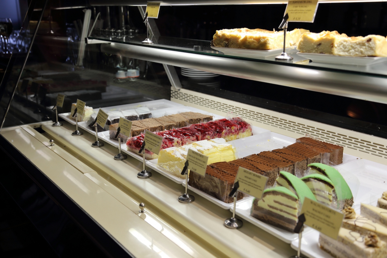 こちらでは夜にピアノの生演奏をやっています。深夜まで営業していますし、立地的にも楽友協会や国立歌劇場、コンツェルトハウスから近いので、公演の前後に食事に行くのに丁度良い場所と思います。なお、ケーキ類はカフェ・ラントマンで見たのとほぼ同じでした。同じ系列のカフェなのかも知れません。