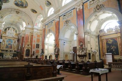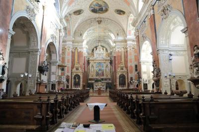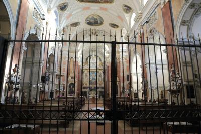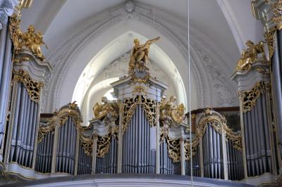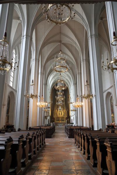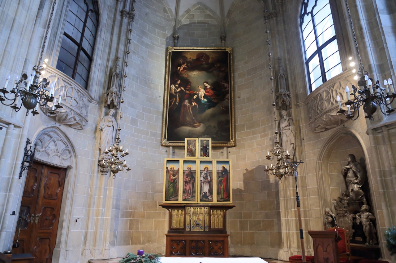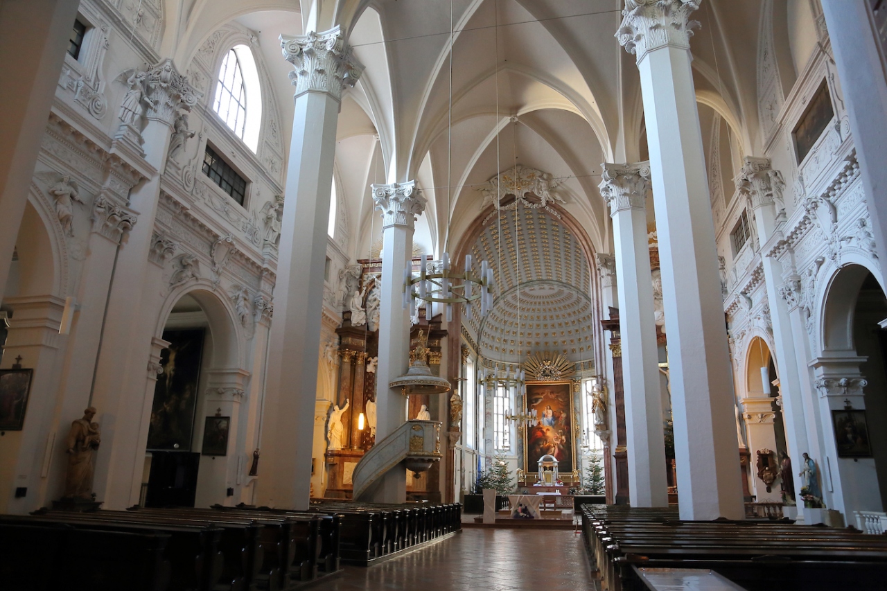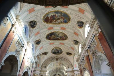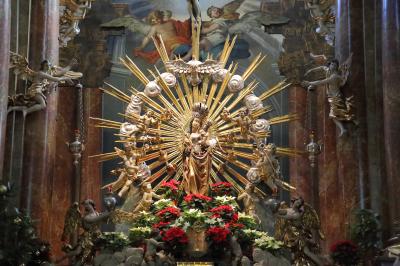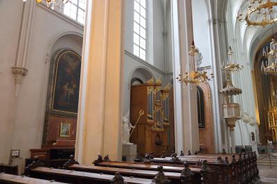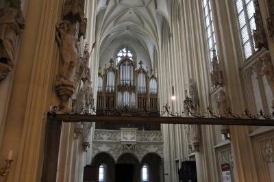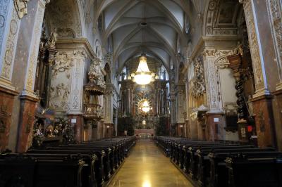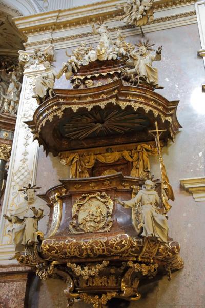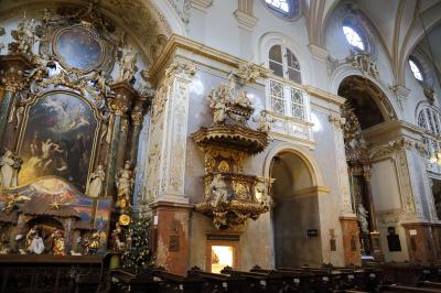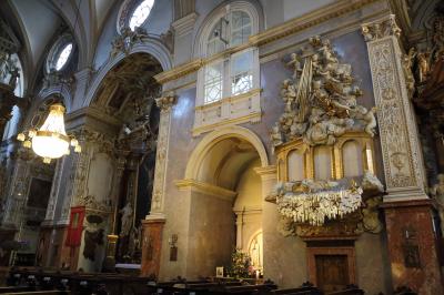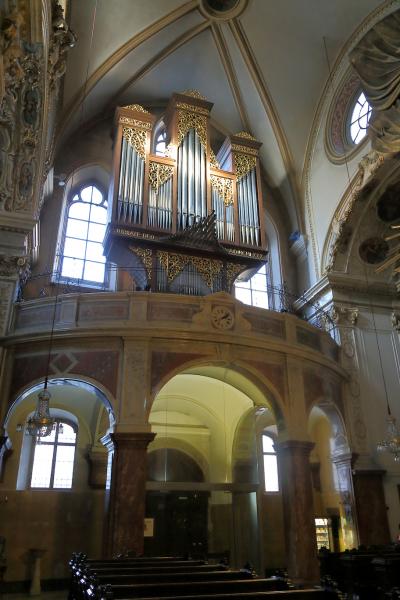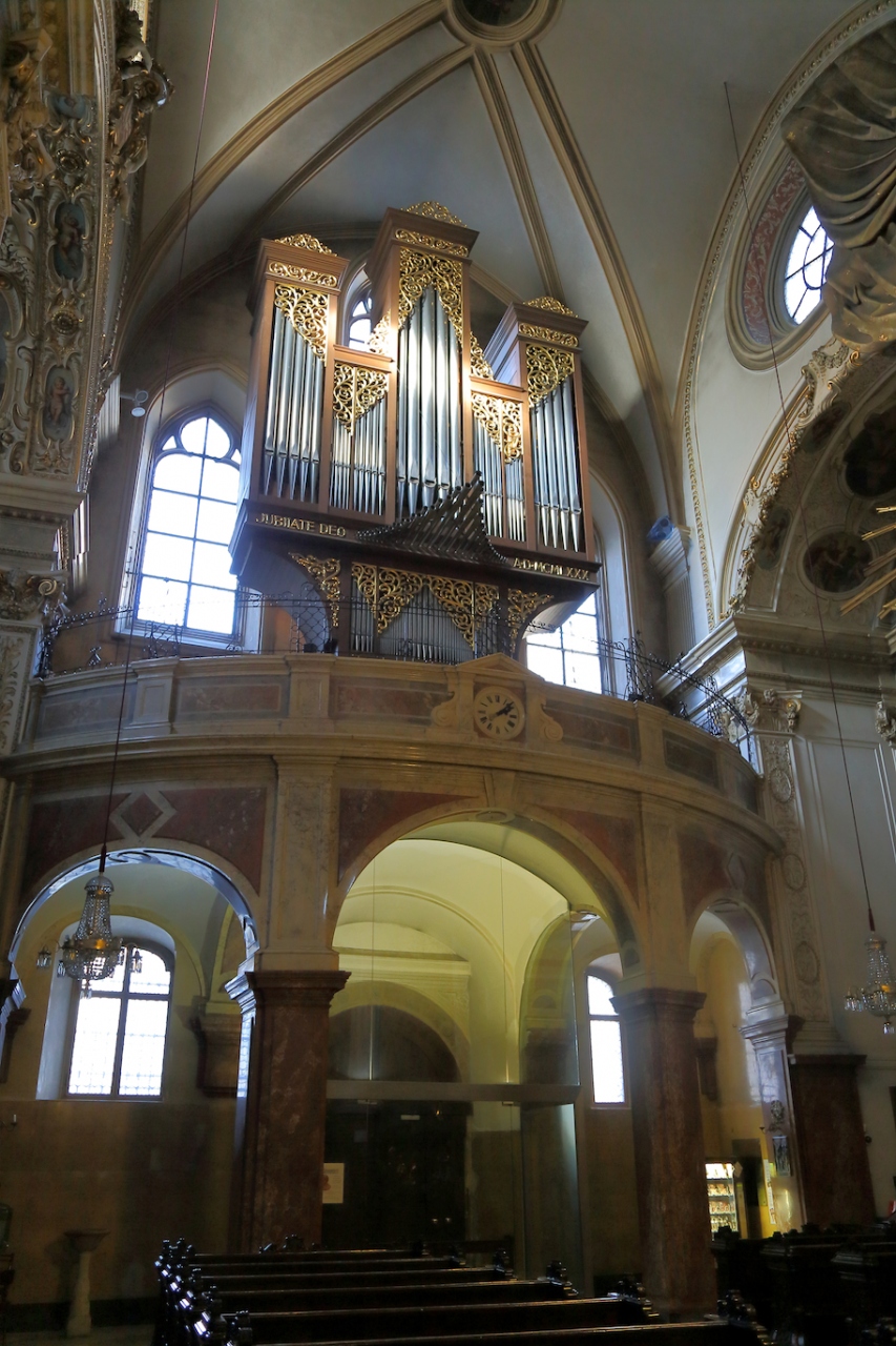 ザルツブルクにも同名の教会があって、あちらはロマネスクからバロックまで融合した感じですが、こちらはゴシックとバロックが融合した感じです。ファサードは無骨でゴシックの雰囲気ですが、中に入ると物凄く華美なバロック装飾が施されています。あと、教会には珍しく、シャンデリアがぶら下がっています。