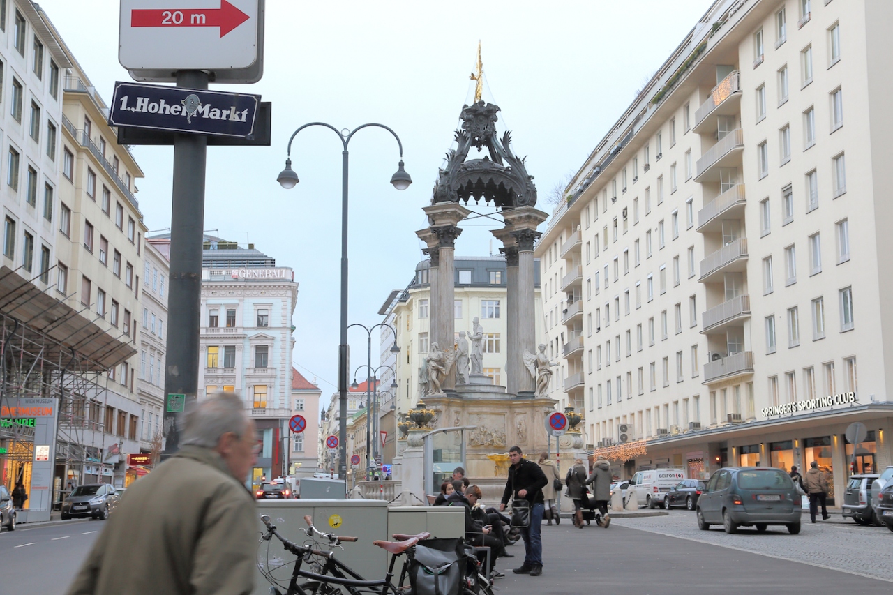 ウィーンで一番古い広場で、ハプスブルク家以前の中世ウィーンの中心だった場所です。シュテファン大聖堂の真北に位置していますが、一直線で行ける道はありません。シュテファン広場からならグラーベン通りを真っ直ぐ進み、コールマルクト通り(ミヒャエル門方向)と逆方向に真っ直ぐ行くと良いでしょう。その内に開けた場所が見えますので、そちらがホーアーマルクトです。