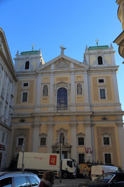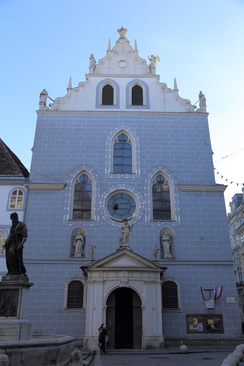 ウィーンの旧市街にある教会ですが、ちょっと場所が解り難いです。ケルントナー通りのSwalovskiがある交差点を東に曲がり、ヴァイブルクガッセを真っ直ぐ進むと小さな広場があり、その広場に面して建っています。ガイドブックに必ず出ているクライネス・カフェが同じ広場に面していますから、クライネス・カフェを目指していけば見つかる筈です。